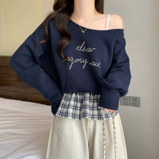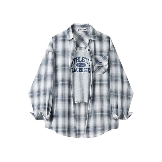 チェック柄レイヤード風トレーナー|カレッジ風フェイクレイヤー長袖トップス/チェック折り返しワイドデニムパンツ|ハイウエストストレートジーンズ番号ZT732