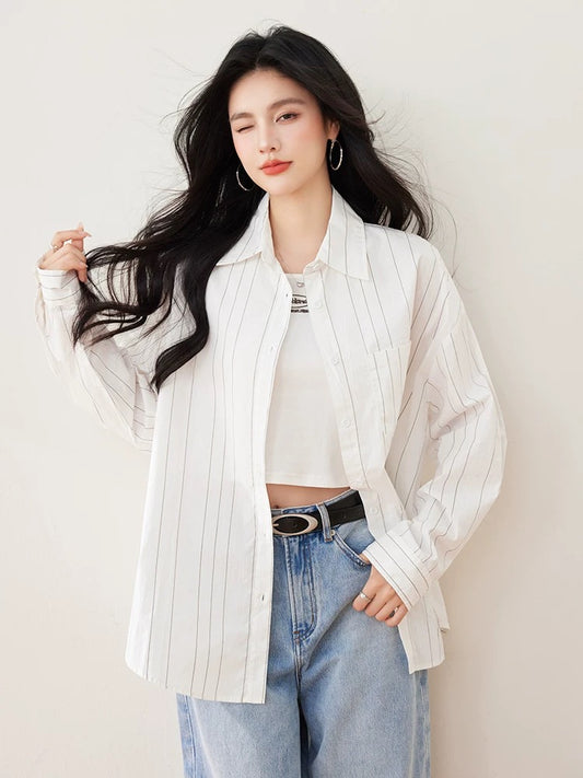 韓国風ゆったりストライプシャツアウター レディース 春秋万能レイヤード風カジュアルセットアップ/韓国風ハイウエストデニムパンツ レディース ゆったり美脚ヴィンテージワイドパンツ番号ZT723