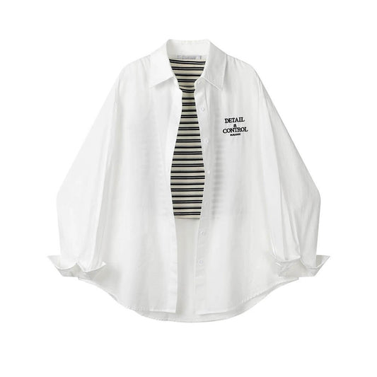 レトロストライプ刺繍ワイドシャツセット 春秋対応 オーバーサイズベスト&長袖シャツ レディースカジュアル 韓国風2点セット番号ZT724