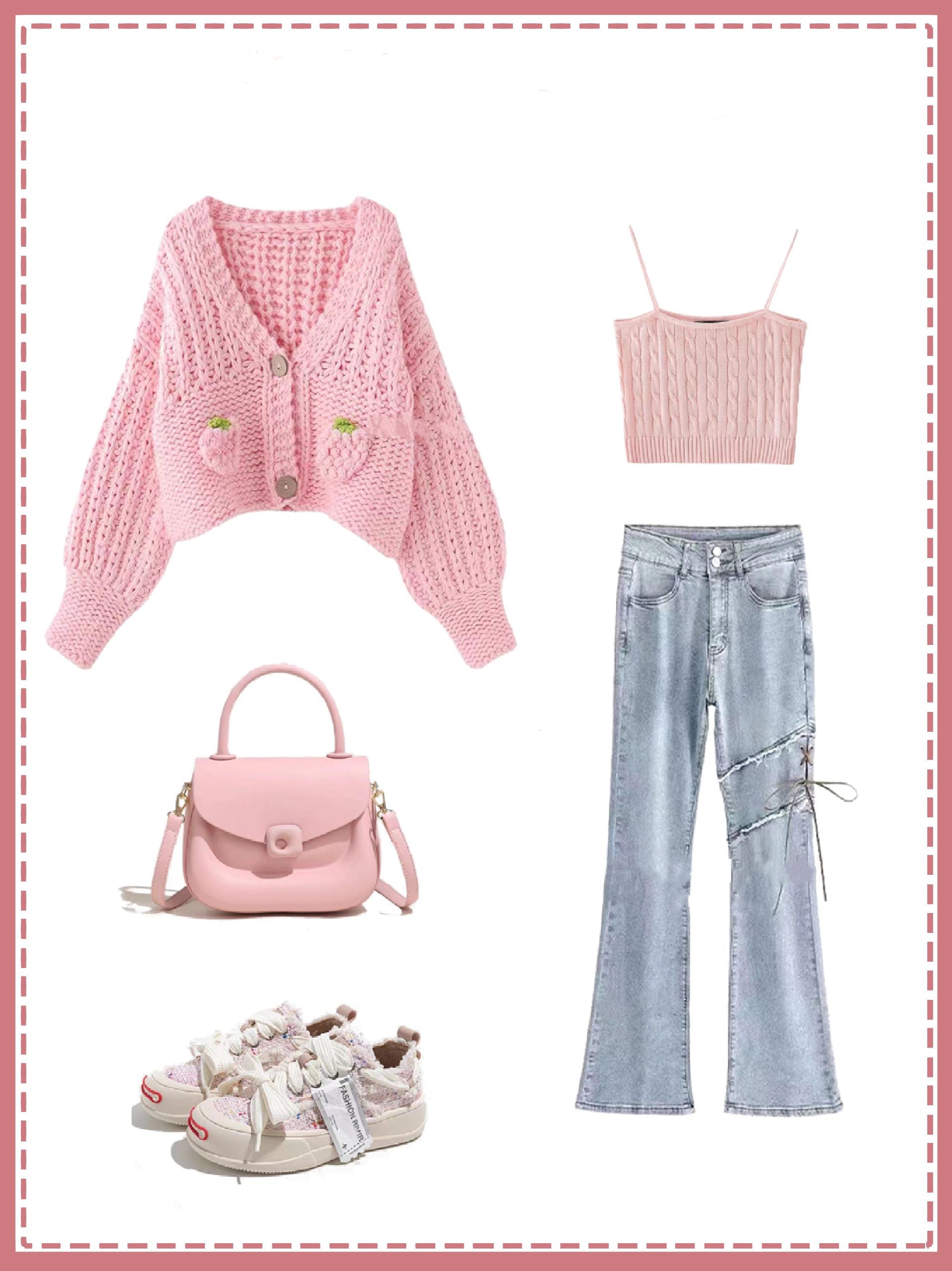 かぎ針セーラーレディスイート風ピンクイチゴVネックショート丈ウォータージャケットトップス/アメリカ風ギャルリボンジーンズ女性2023年新作ハイウエスト小柄マイクロフレアパンツトレンドins番号ZT414