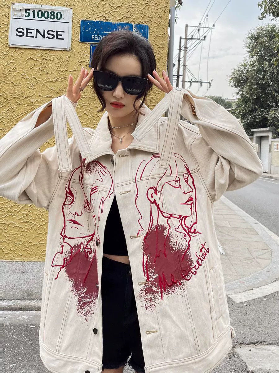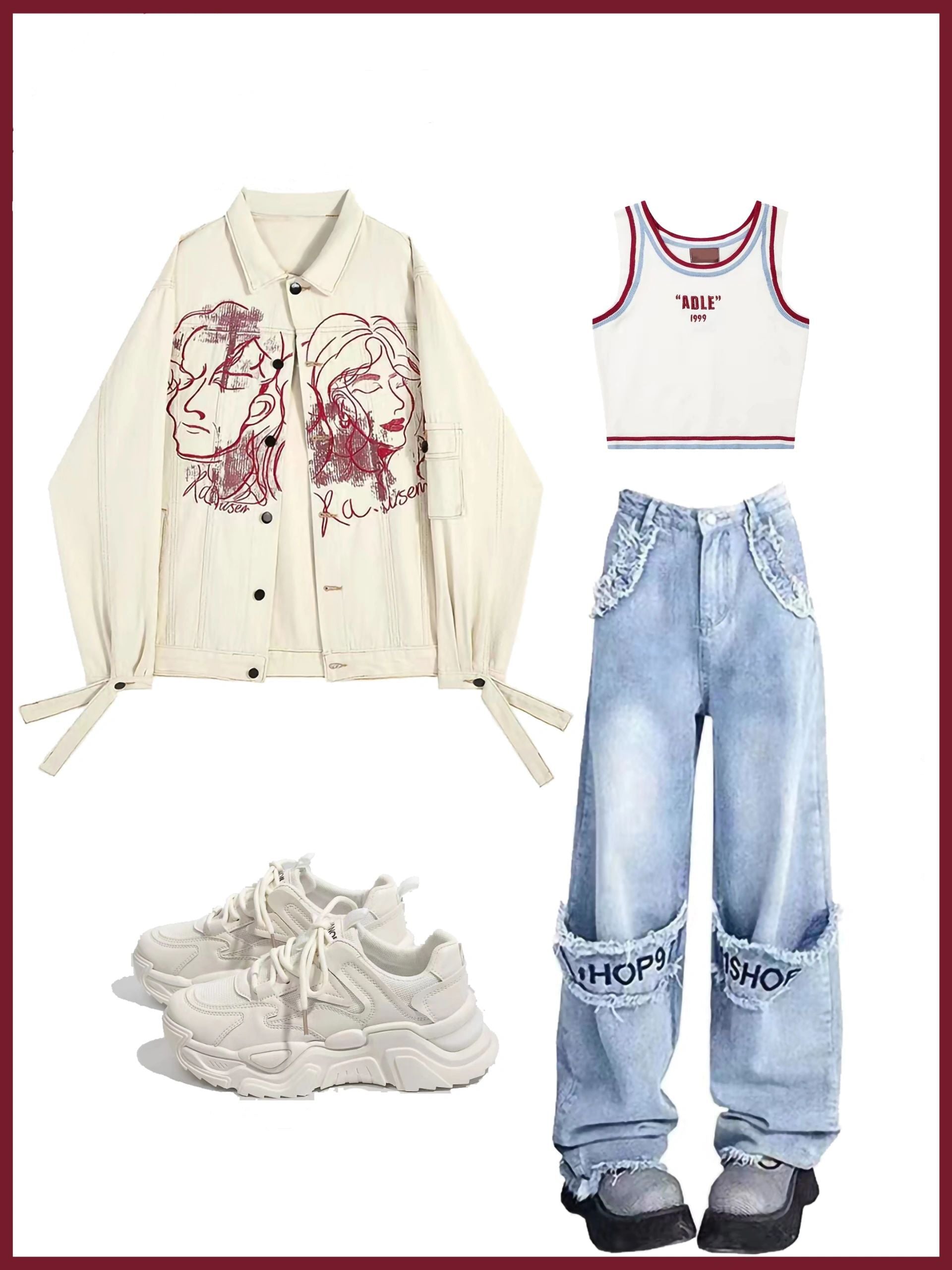 アプリコットゆったりデニムジャケットトレンドブランド秋新作刺しゅうプリントヴィンテージ風デニムジャケット/甘辛bm風ショートタイプ工字タンクトップ女性の上にギャルカジュアルハイウエストキャミソール番号ZT476