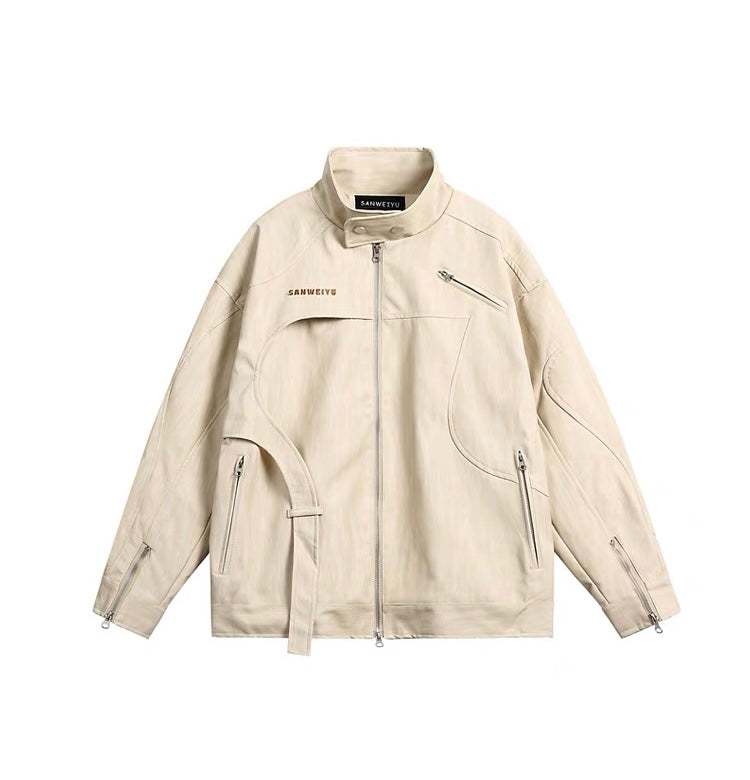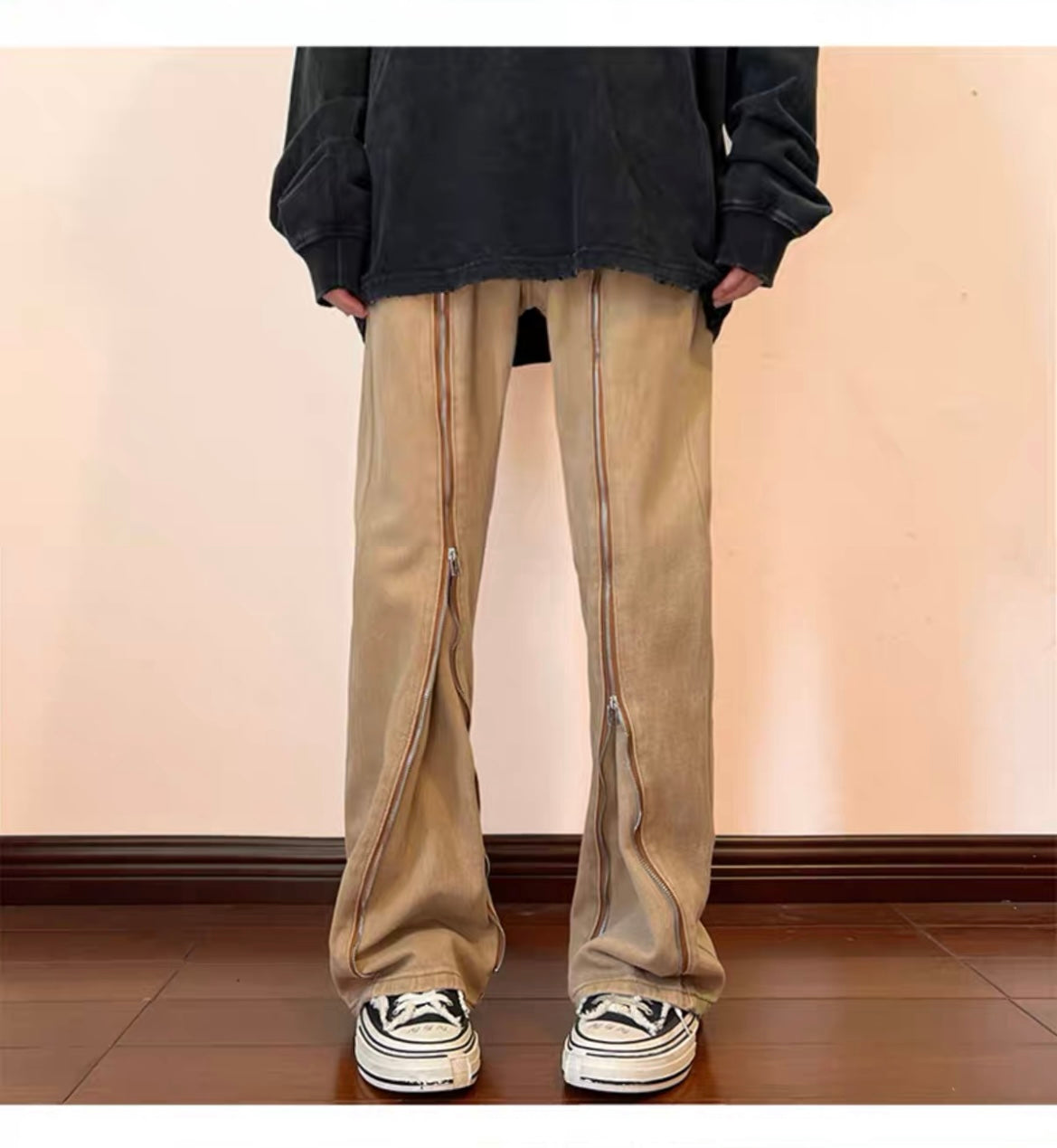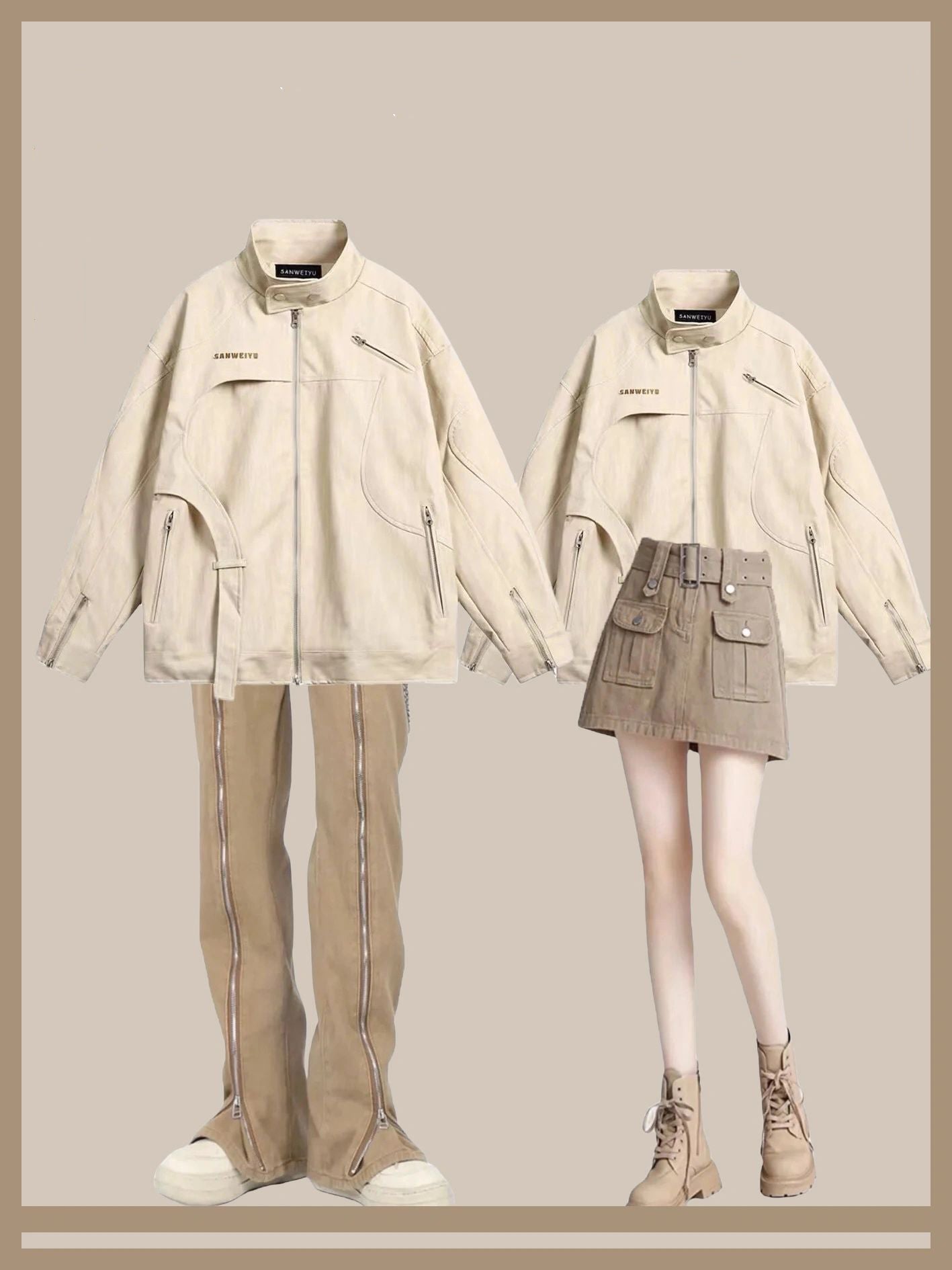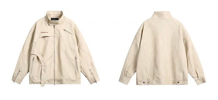 アメリカレトロなニッチスタンドカラージャケットカップルトレンドブランドゆったりとしたハイストリートコーディネート自在のコート/カーキ色マイクロフレアジーンズ夏の薄手欧米vibeパンツハイストリートinsジップストレートパンツ番号ZT588