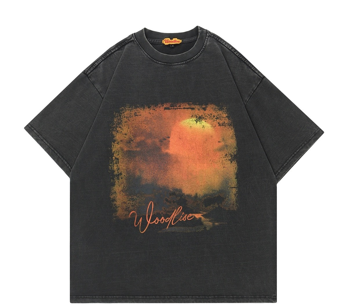 アメリカンハイストリートヴィンテージサンセットプリント中古半袖Tシャツ厚手ウォッシュ加工ゆったりカジュアル半袖番号ZT304
