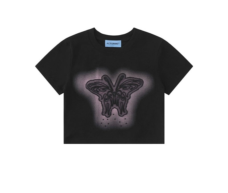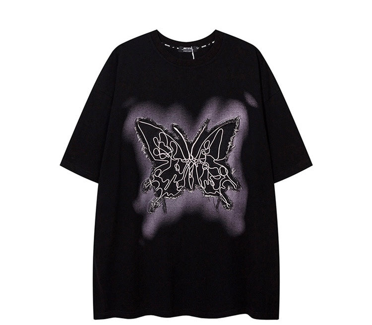 アメリカンバタフライ刺しゅうダダ風半袖Tシャツoversizeペアトップス 蝶刺しゅうプリントY2Kスウィートスパイシーショートトップス番号ZT370