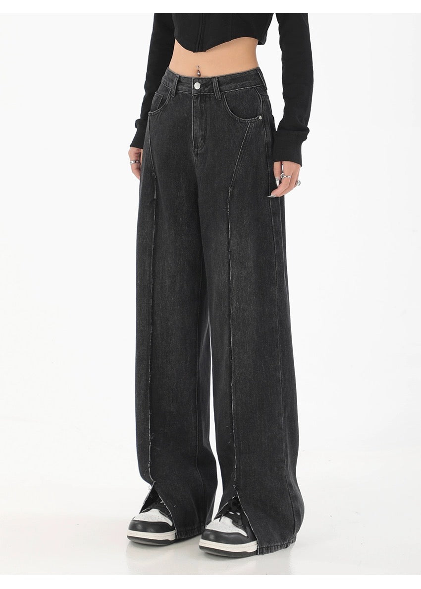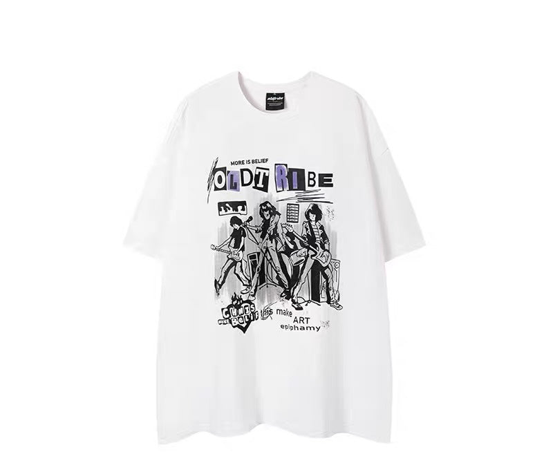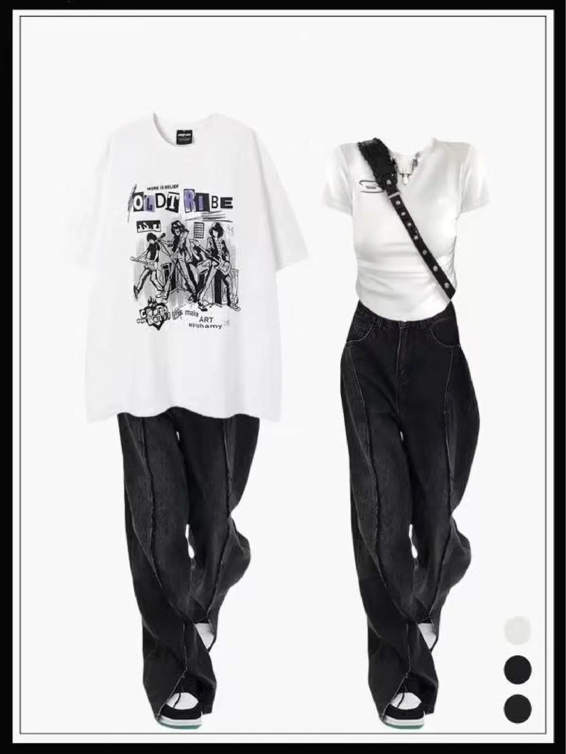 アメリカンヒップホッププリント半袖Tシャツ女性夏ゆったりコーディネート自在カップルTシャツ 黒グレースリットジーンズ番号ZT275