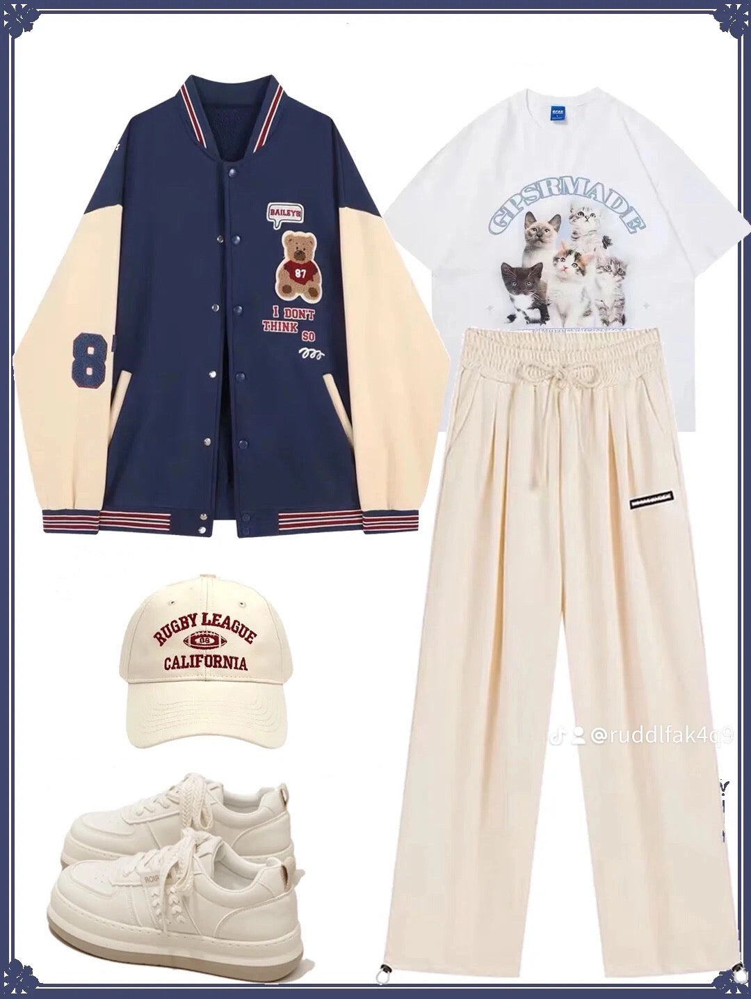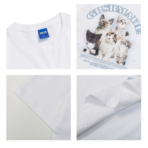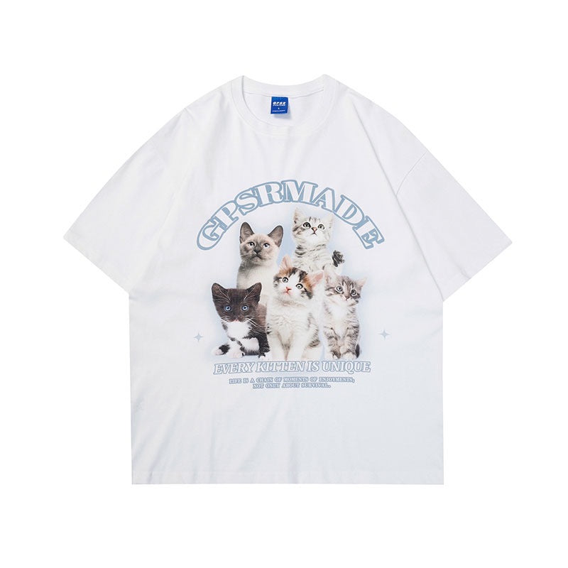 アメリカンヴィンテージカジュアルスタジャン可愛い猫プリント半袖Tシャツカジュアルカップルタイプラウンドネック上着夏服ハイウエストドレープ感ストレートワイドパンツ番号ZT47