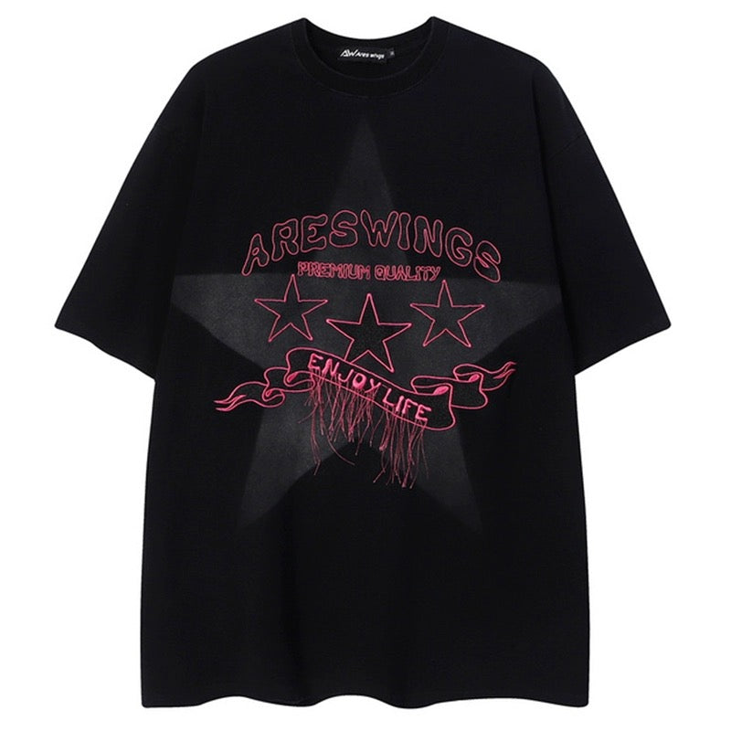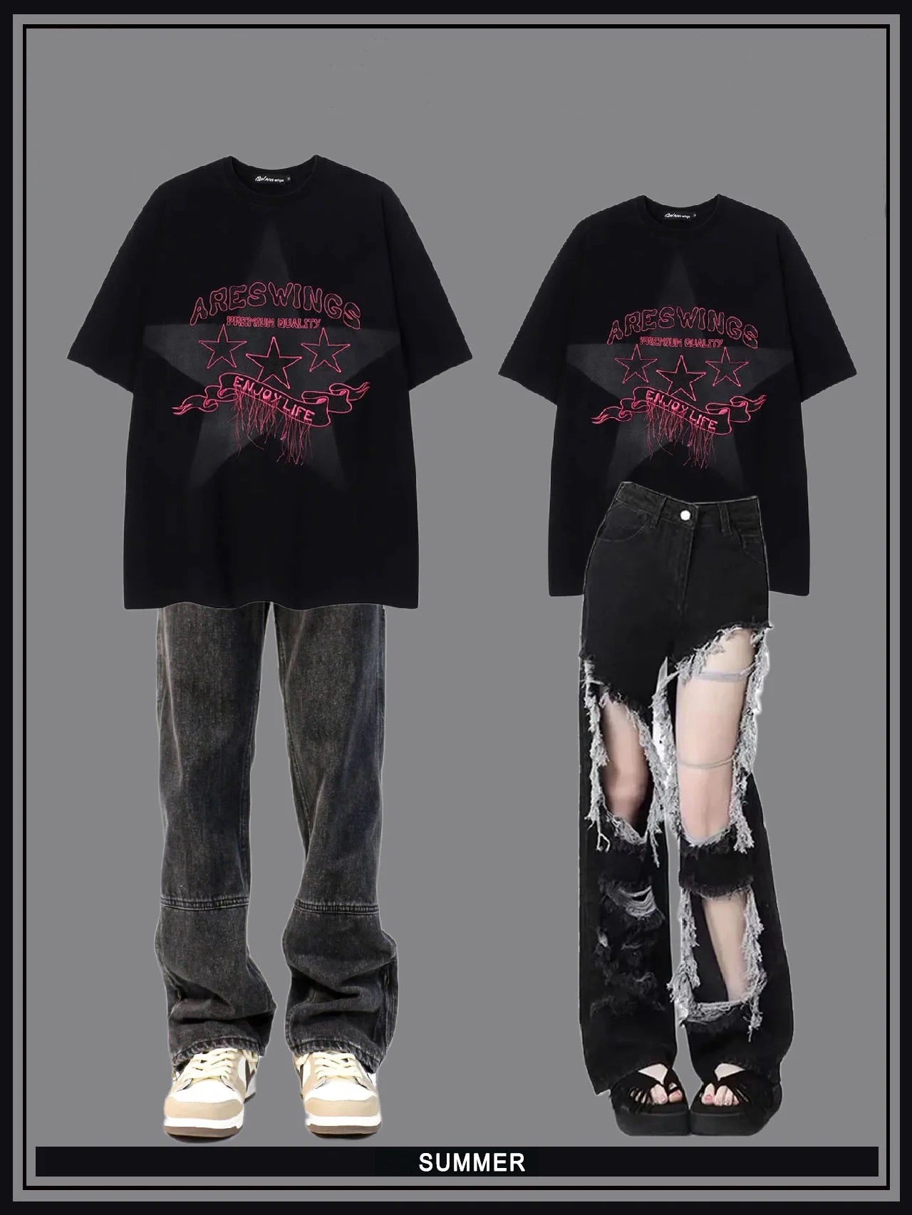 アメリカンヴィンテージストリートスタープリント半袖Tシャツ夏ゆったりカジュアルコーディネート自在Tシャツ/ニッチなデザイン感ジップタイトジーンズアメリカ風ビンテージゆったりストレートハイストリートパンツ番号ZT320