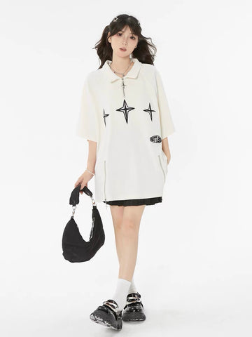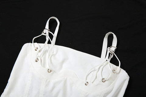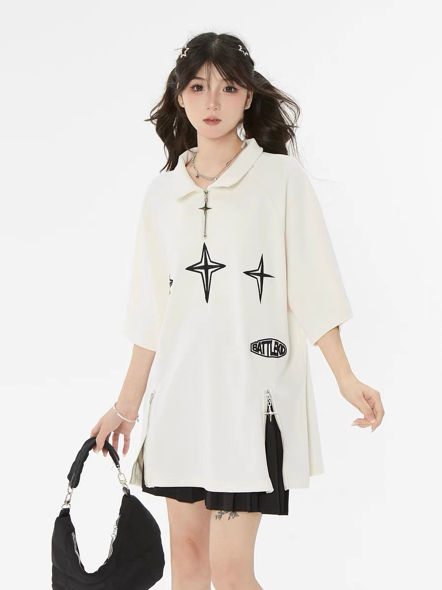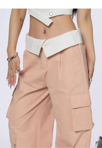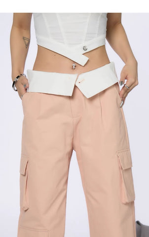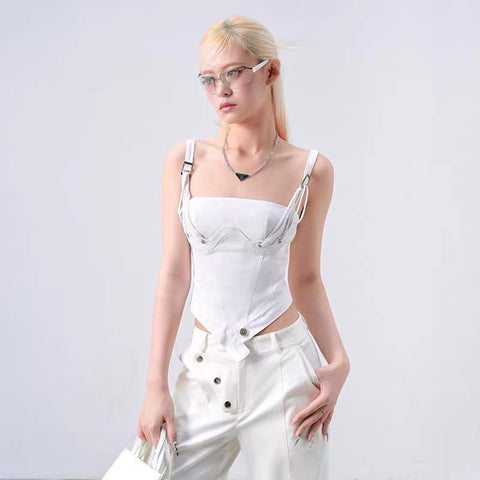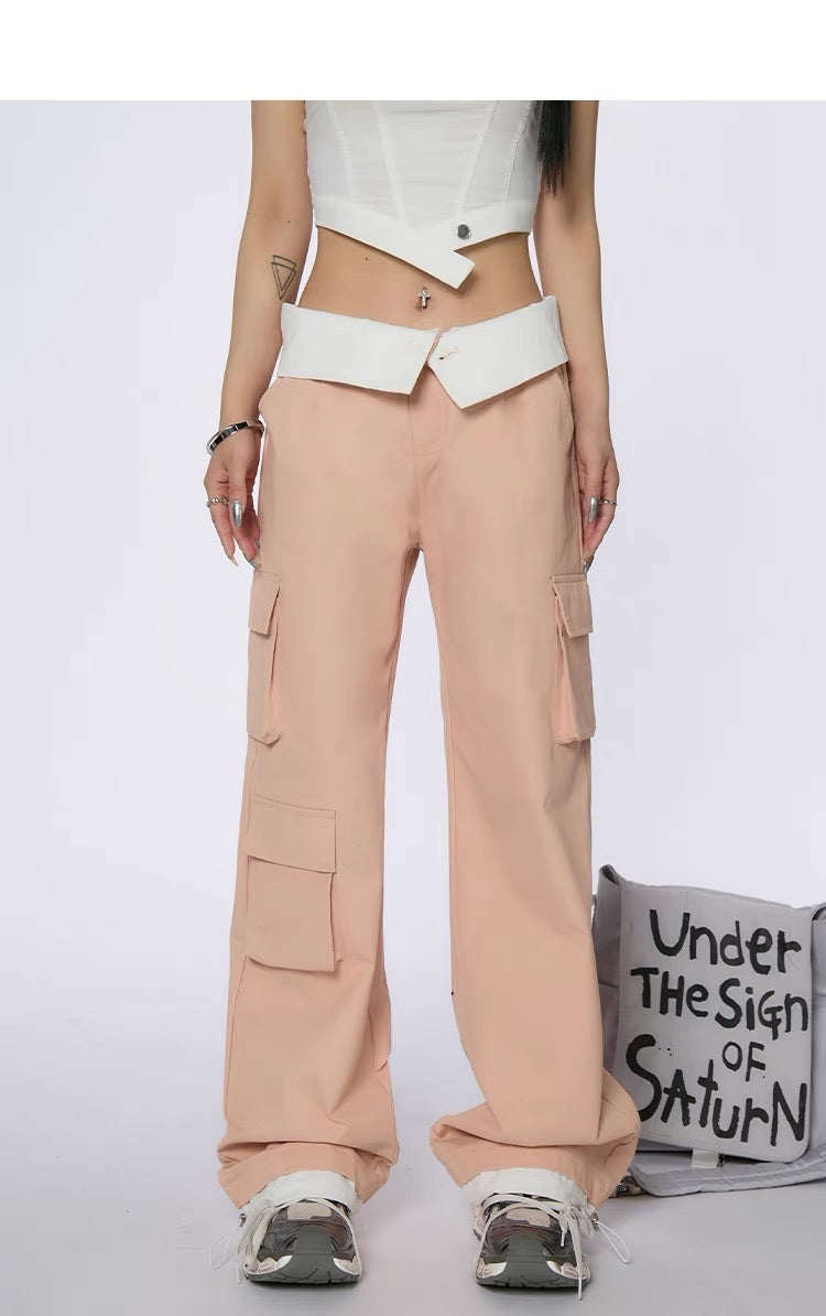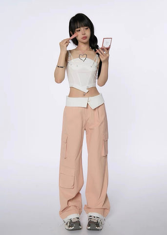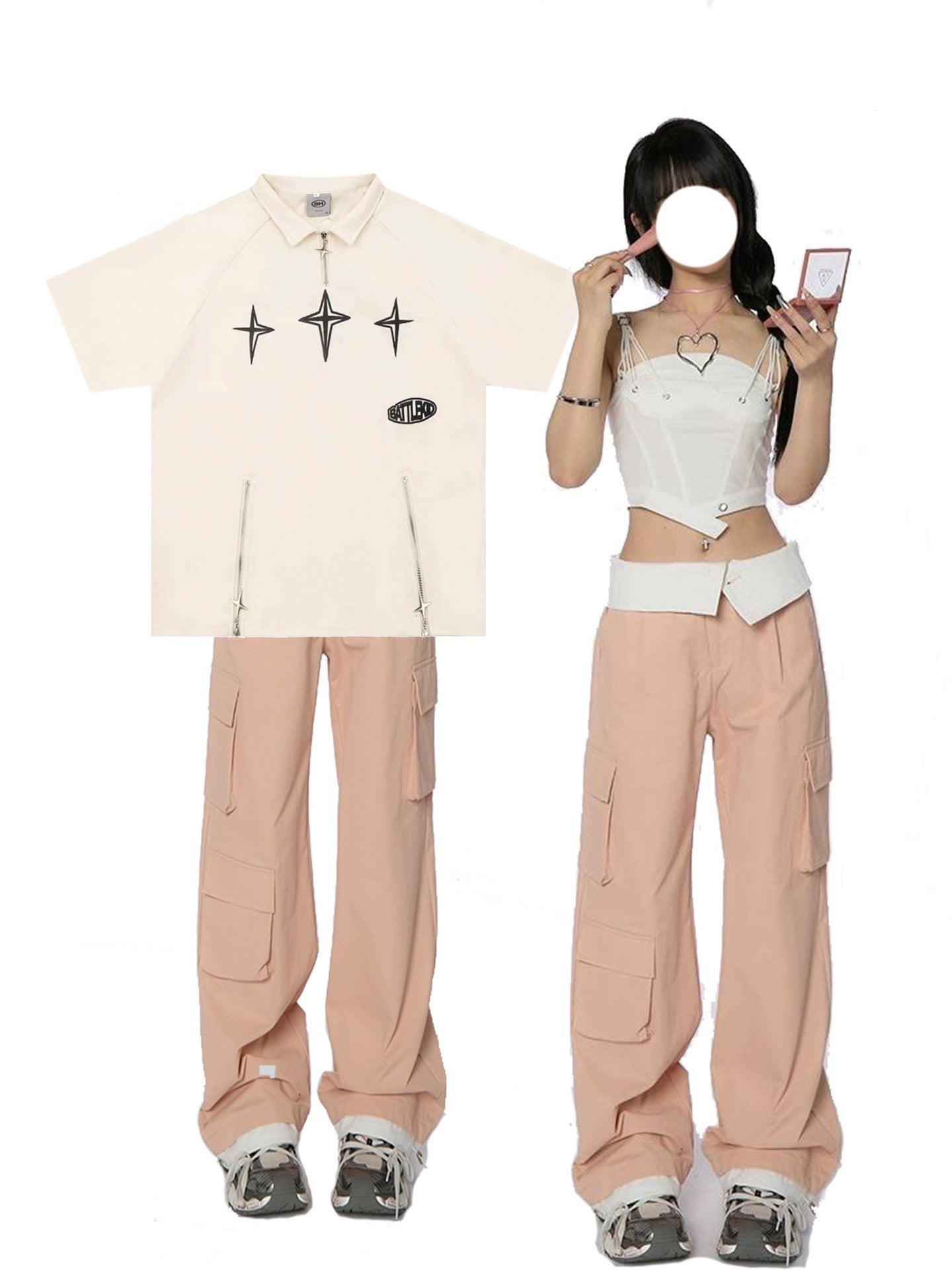アメリカンヴィンテージセレブホワイトデザインファスナーPOLOシャツ半袖ペアルック上着 タンクトップセクシー背中見せタンクトップ コントラスト色フリルストレートパンツ女性夏米風カーゴロングパンツ番号 ZT472