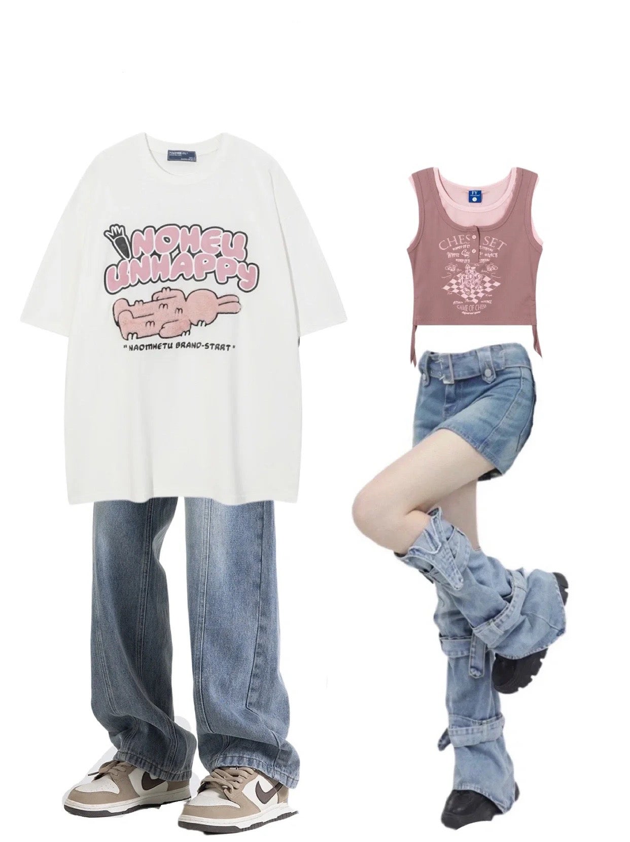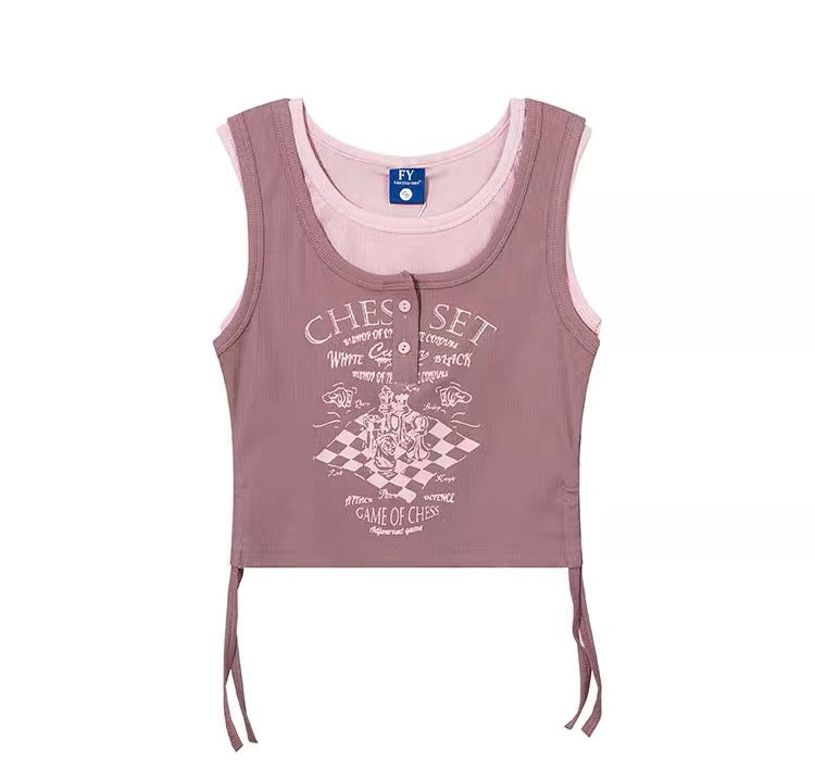アメリカンヴィンテージフェイクレイヤード着古しプリントショートタンクトップ女性ギャルニット着痩せタンクトップ アメリカ復古漫画タオル半袖Tシャツゆったりコーディネート自在半袖シャツ番号ZT191