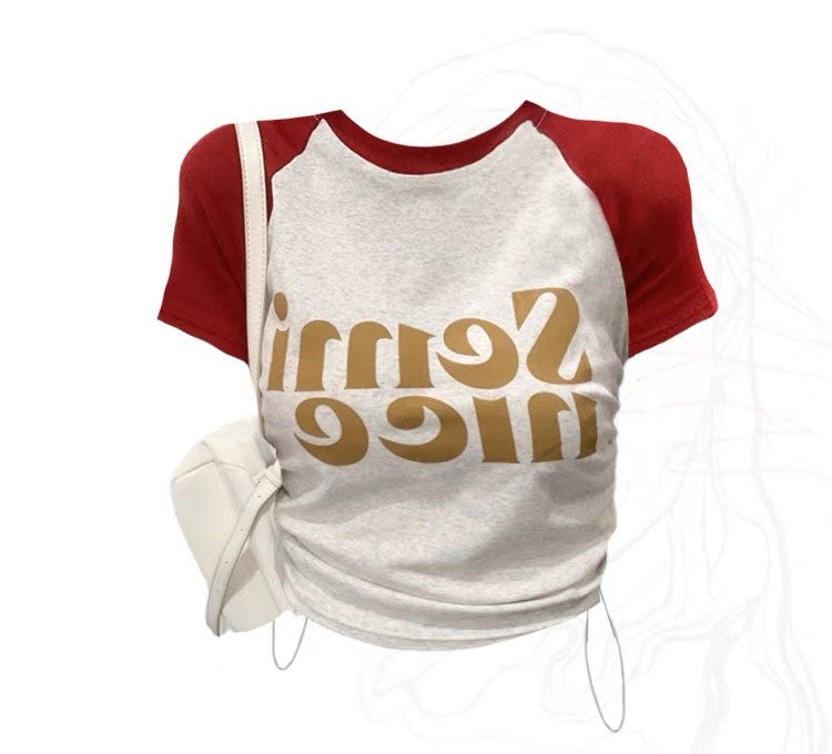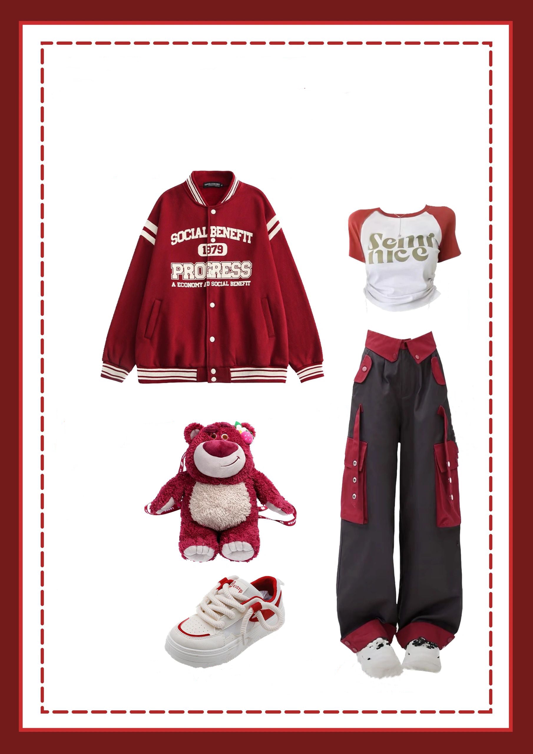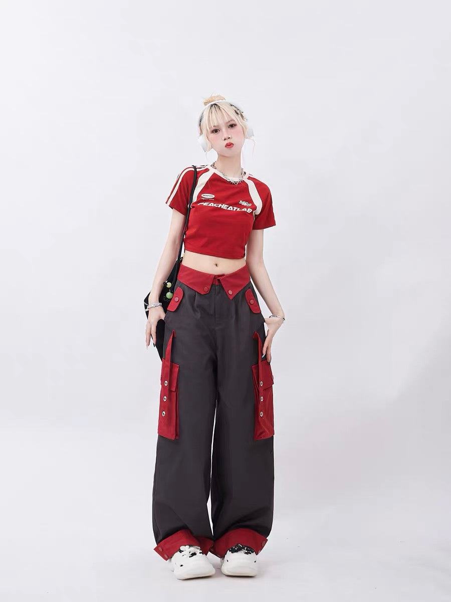 アメリカ復古アルファベットで作られた古い野球服男女トレンドブランドvintageワインレッドジャケットコート/ ラグランショートタイプ半袖Tシャツ女性夏正肩アメリカ式甘辛デザイン感若者向けのスリム純綿上着/カーゴパンツ女性夏アメリカ風ストリートhiphopフラップ大きいポケット混合色デザインストレートパンツトレンド番号ZT552