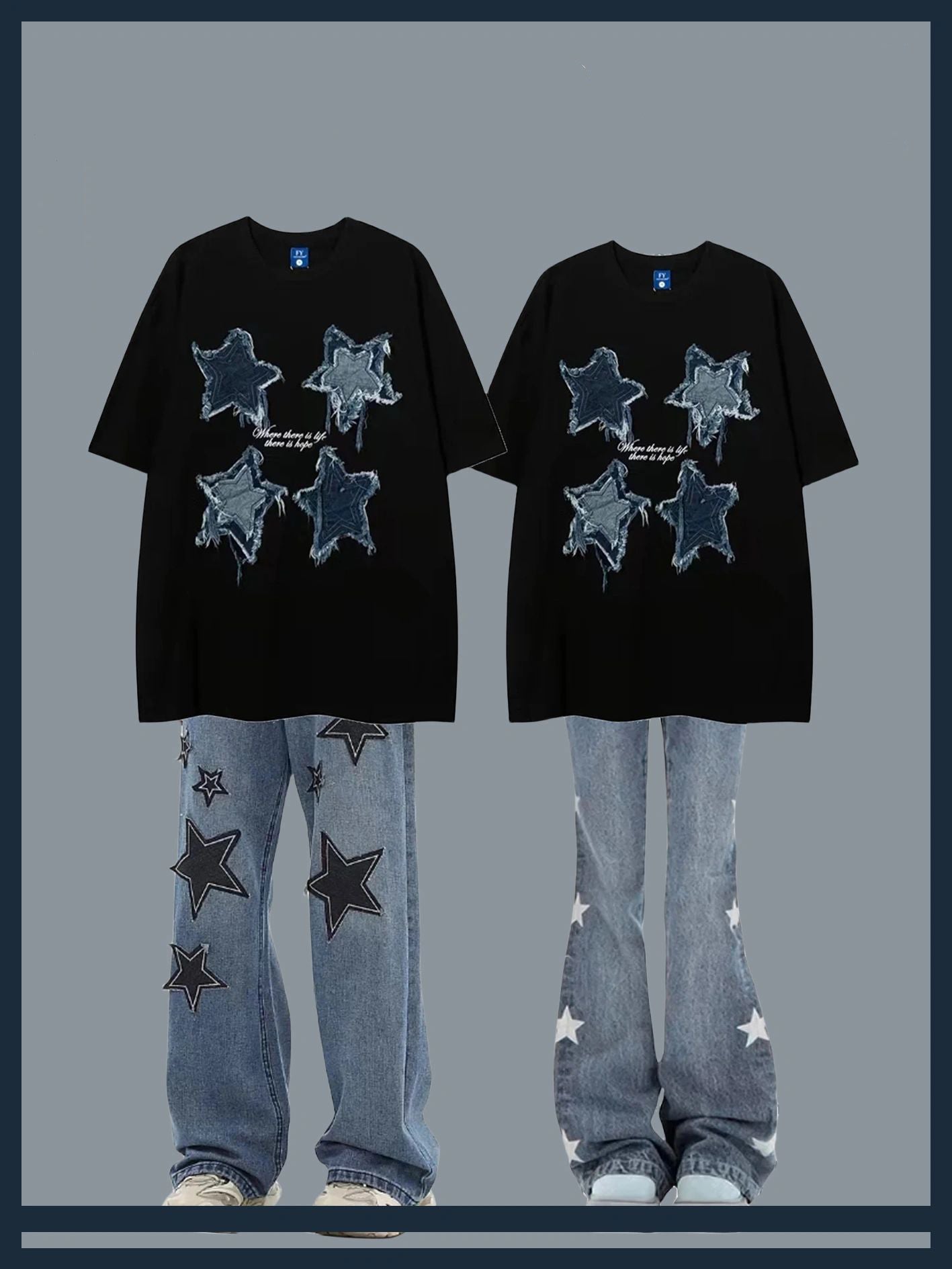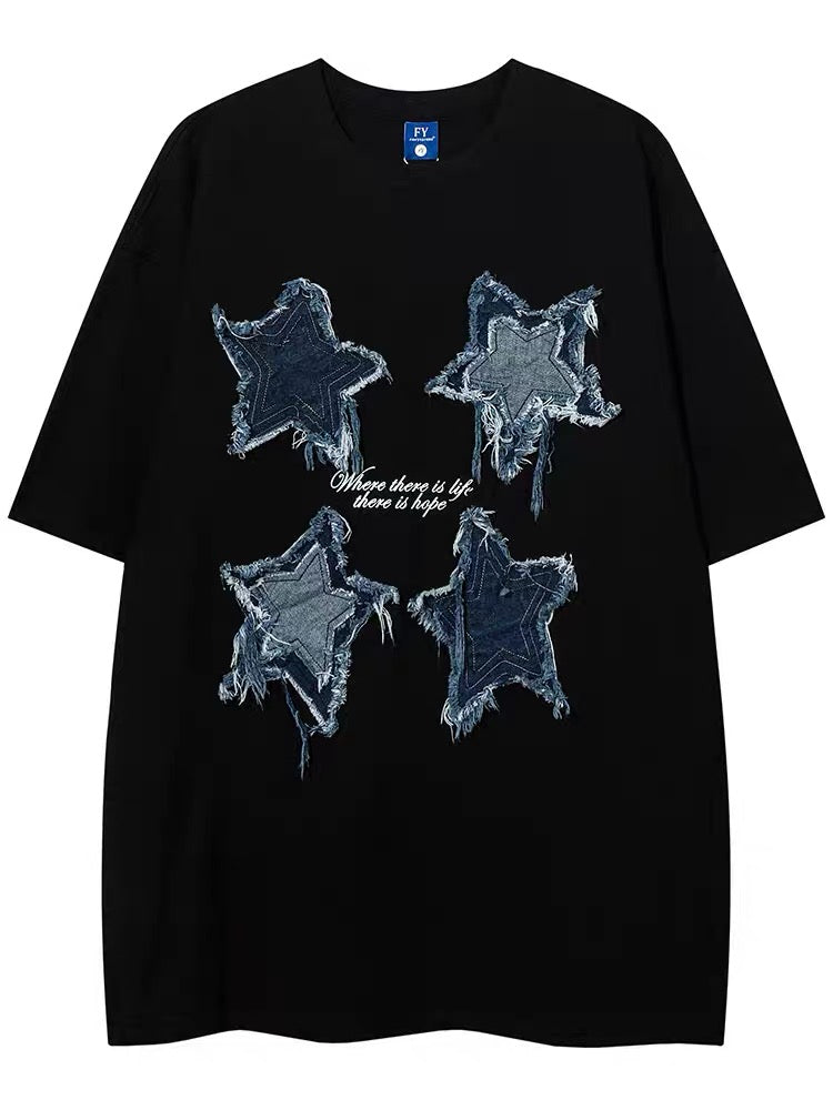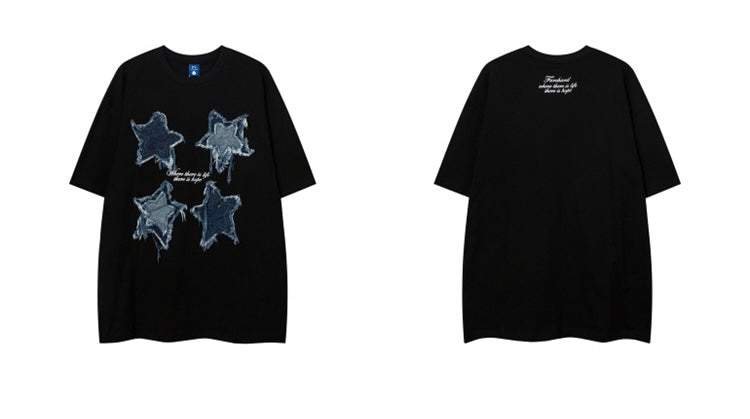 アメリカ風トレンドブランドパッチ五角星半袖Tシャツ男女ゆったりデザインカップル半袖/番号ZT585