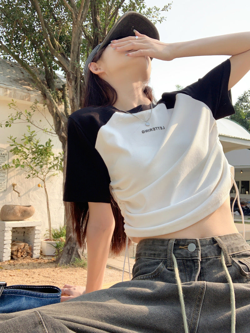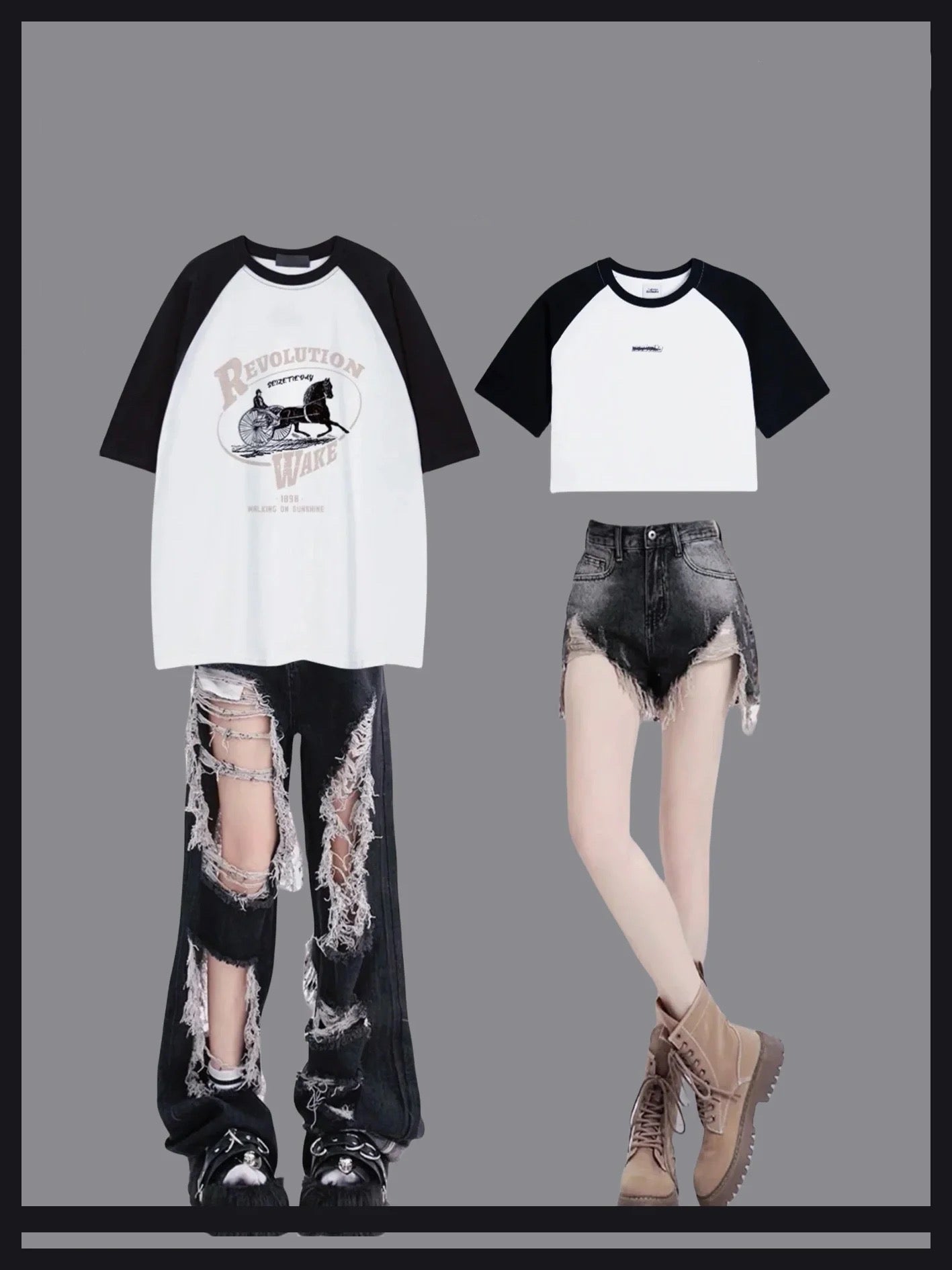アメリカ風復古半袖Tシャツ夏純綿ゆったりラグラン袖大サイズ着痩せ上着 アメリカンクラシックな正肩半袖Tシャツ女性夏色の切り替え紐ショート丈上着 ブラックグレー穴あきデニムショートパンツ女性夏2023新作ハイウエストゆったりボーダーa字痩せギャルホットパンツ番号ZT361