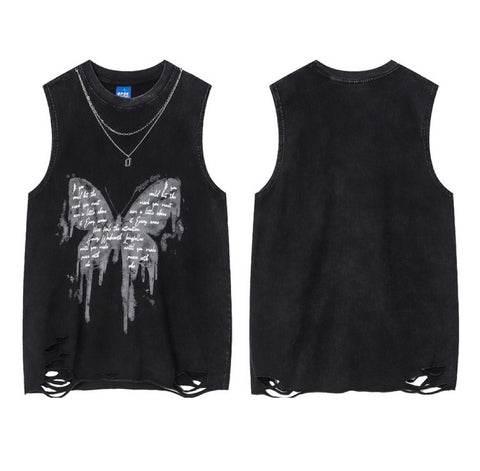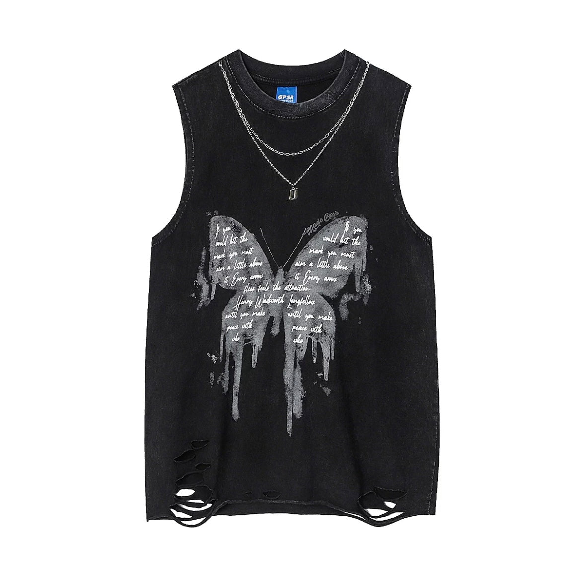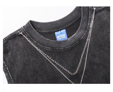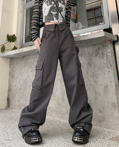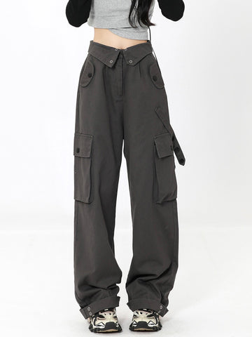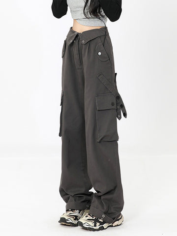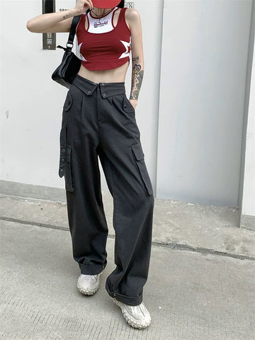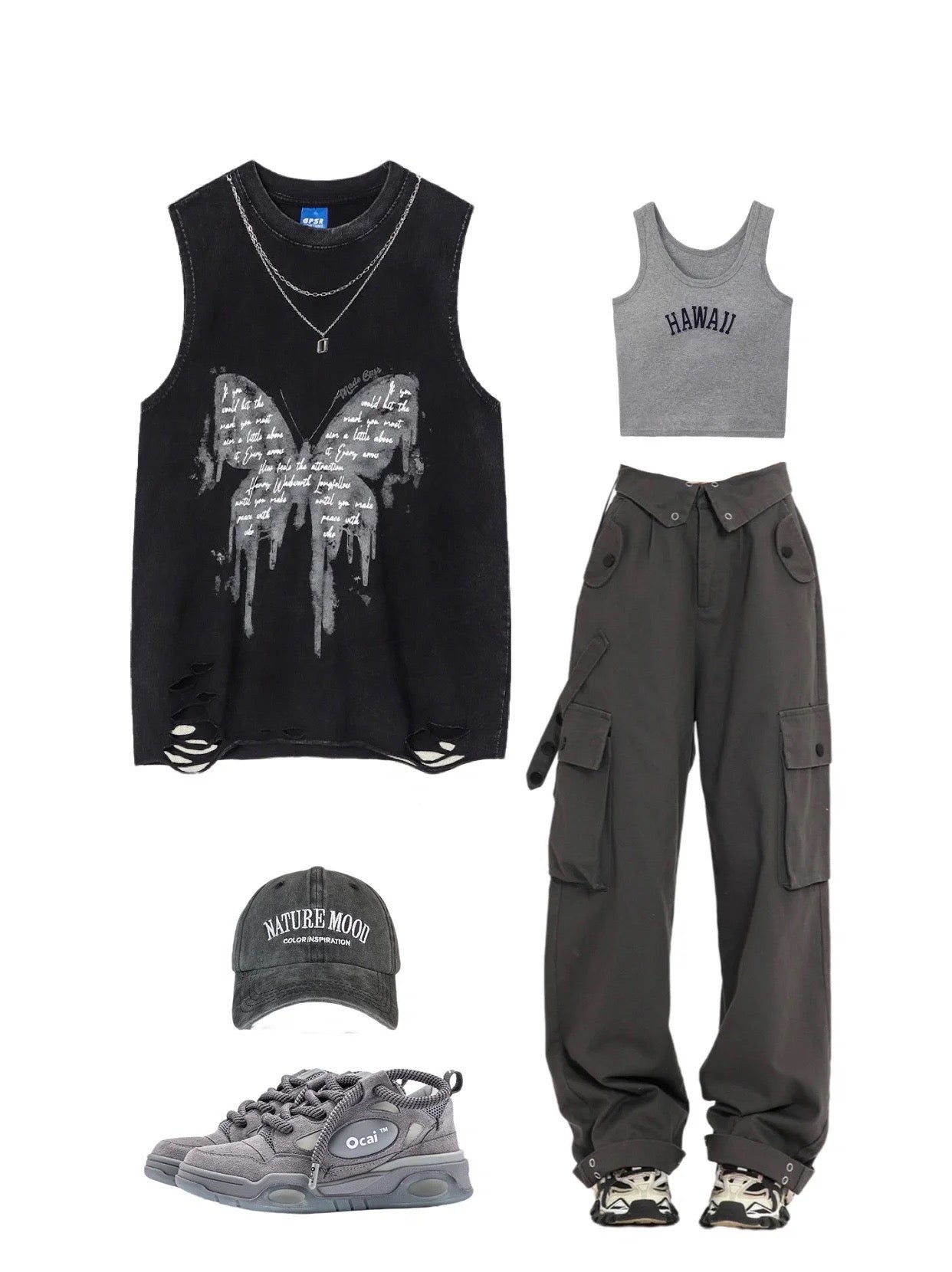 ウォッシュ加工古い蝶ネックレスノースリーブ上着 アメリカンヴィンテージストリートカーゴパンツ女性夏折り返しウエストデザインワイドレッグパンツ番号ZT107