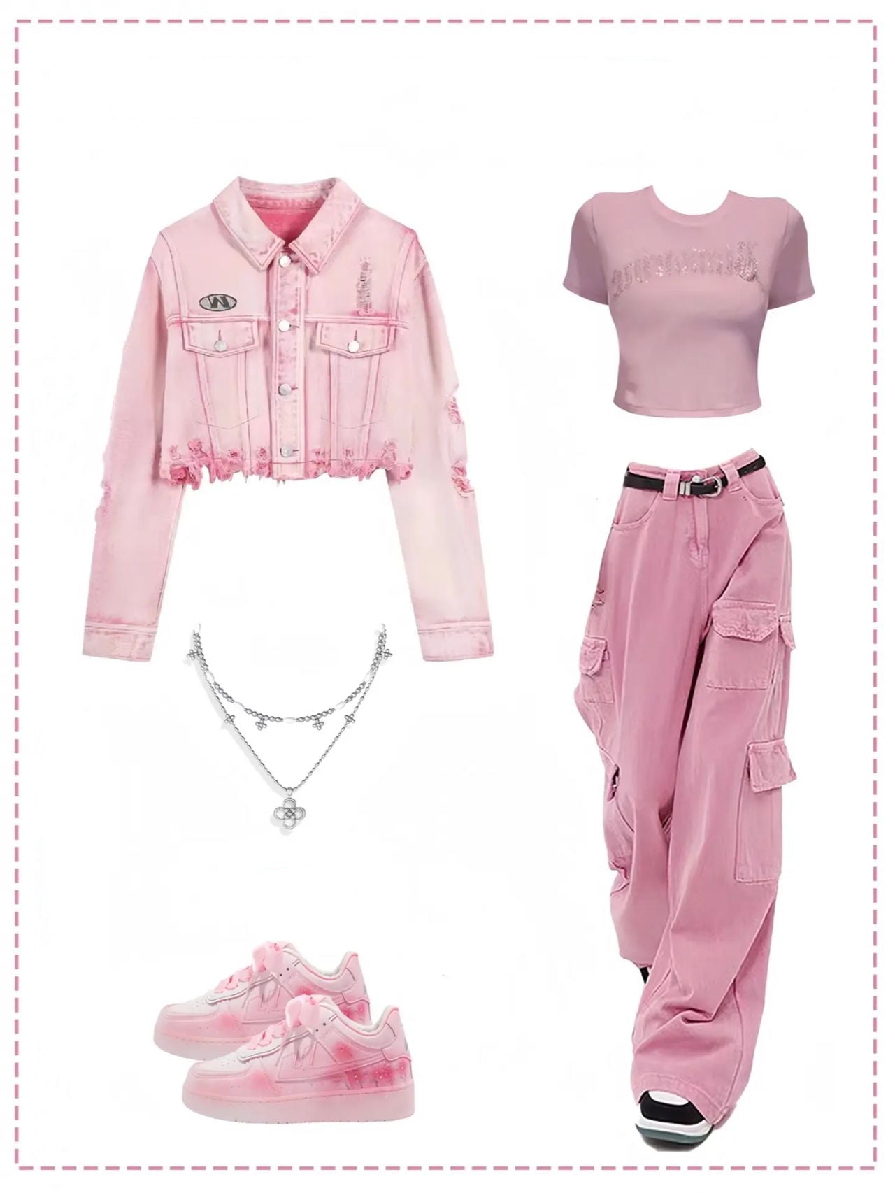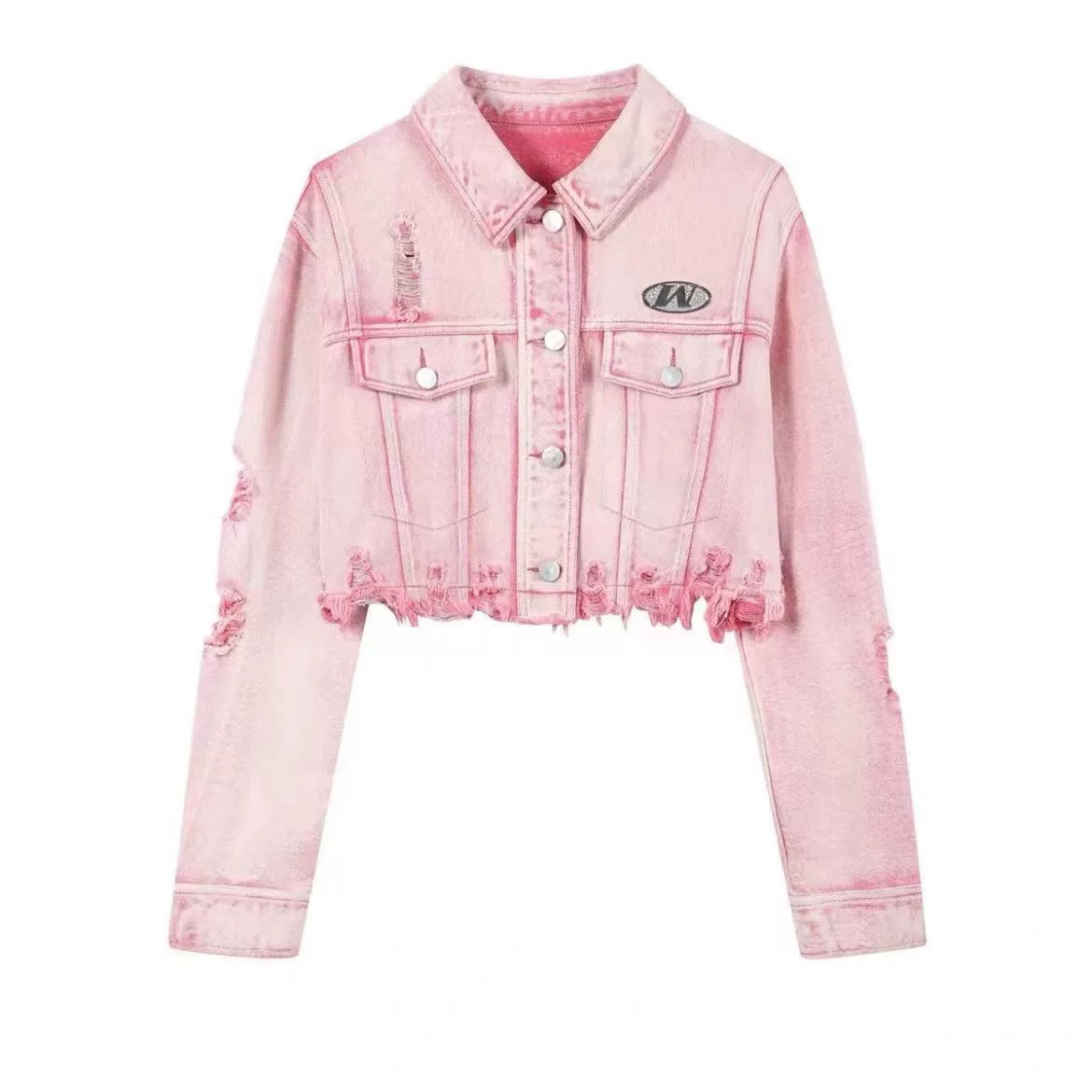 ウォッシュ加工穴あきピンクのデニムショートコート女性秋服ギャル甘めでゆったり着やせ長袖ブルゾンカーディガン/2023新作特注バカ売れタイプアルファベット半袖Tシャツ女夏百コーディネート丸首カジュアル着痩せ上着/アメリカンヴィンテージのマルチポケットカーゴデニムパンツハイストリートhiphopヒップホップでゆったりワイド脚カジュアルパンツ番号ZT496