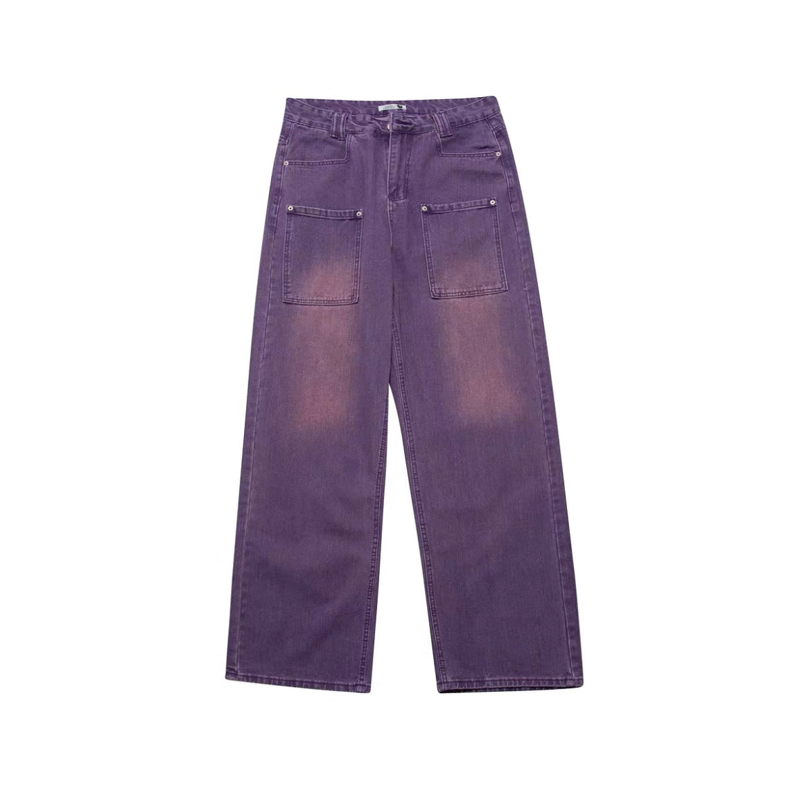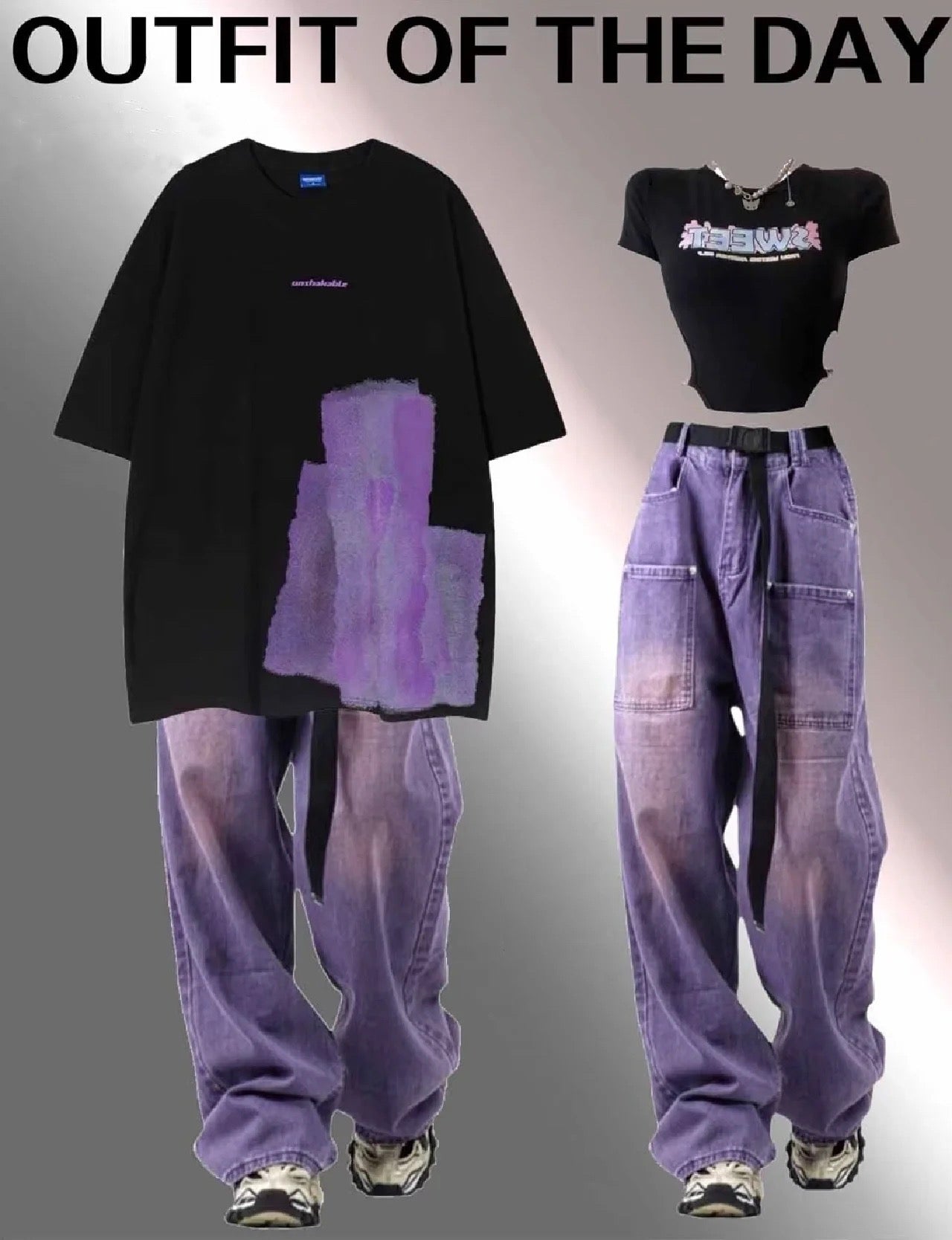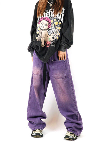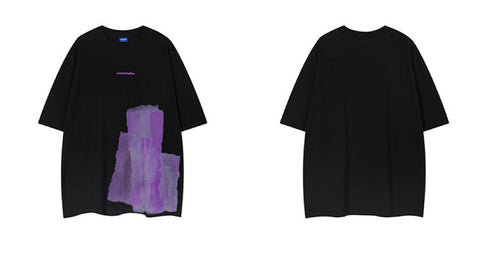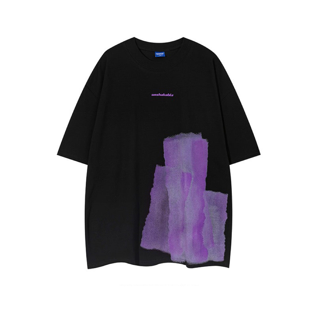 ストリートヒップホップグラフィティプリント半袖Tシャツゆったりカジュアルコーディネート自在Tシャツ アメリカンヴィンテージパープルジーンズウォッシュ加工ヴィンテージストレートパンツ 番号ZT66