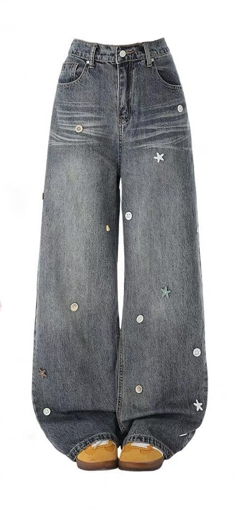 星モチーフやボタンが散りばめられた、Y2Kテイストたっぷりのワイドデニムパンツ。ゆったりしたストレートシルエットとハイウエストデザインで、脚長効果も抜群。カジュアルコーデや韓国系・ストリートスタイルにぴったりの主役級アイテム。