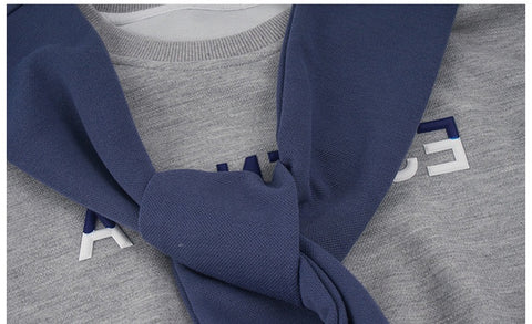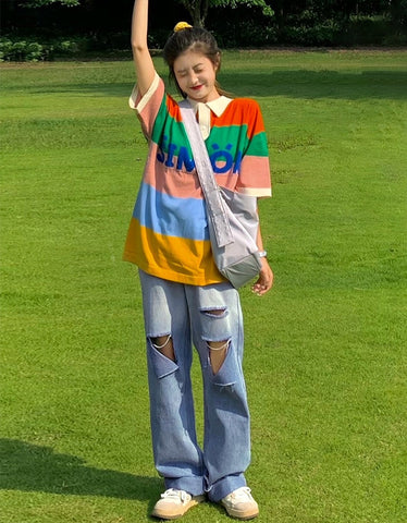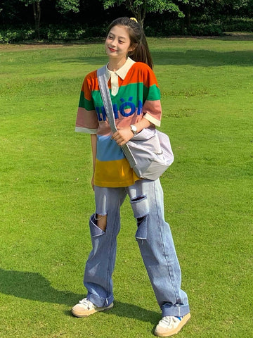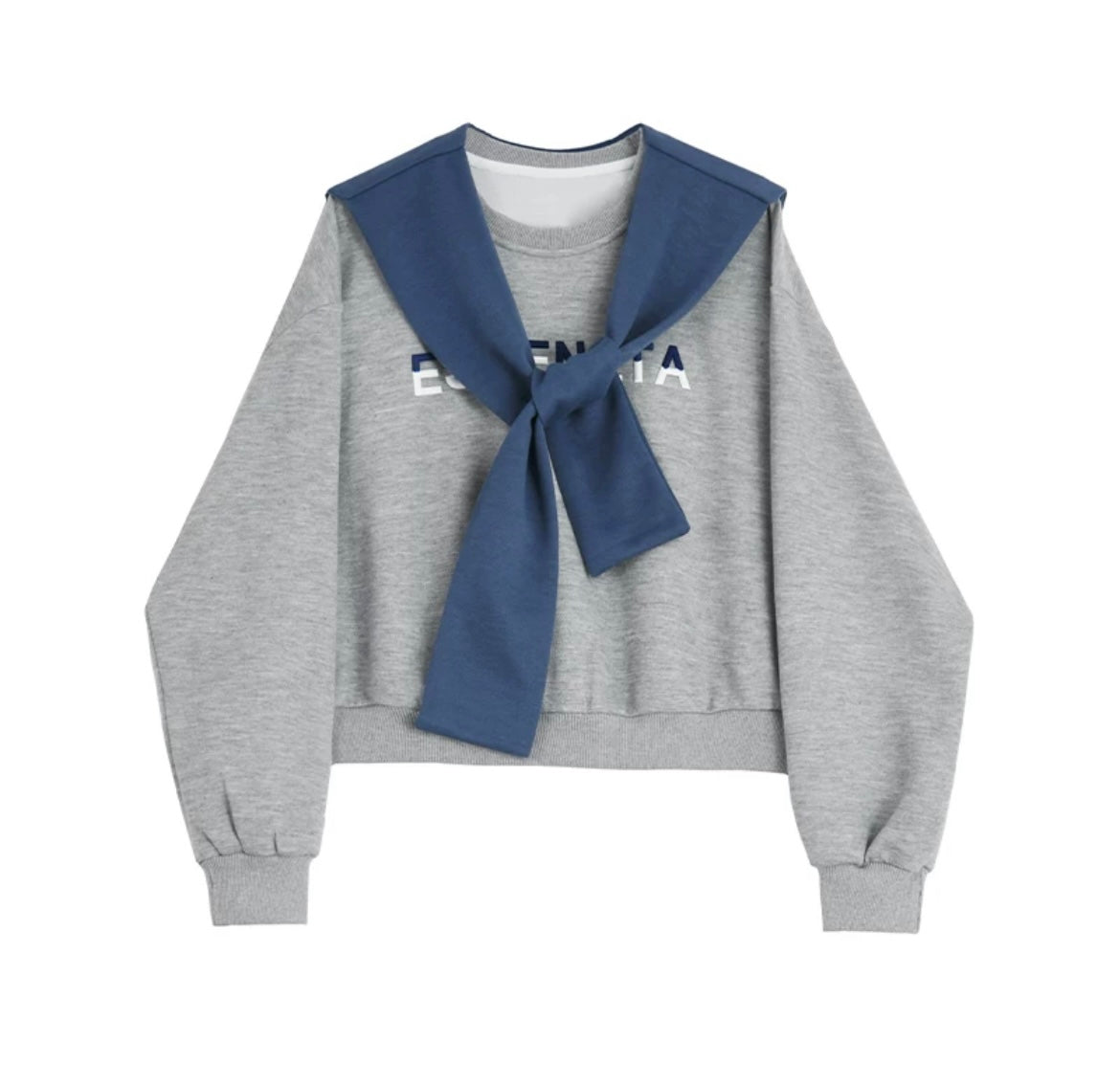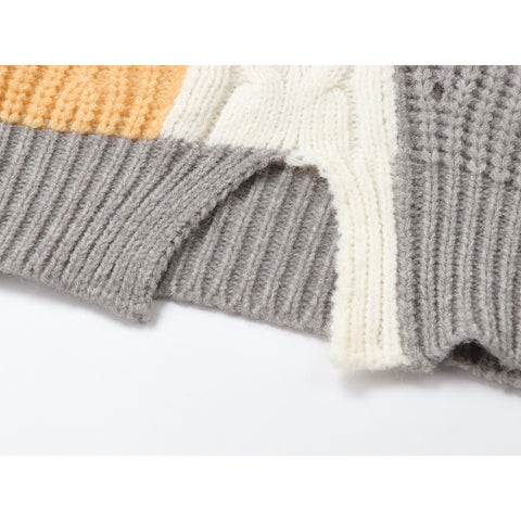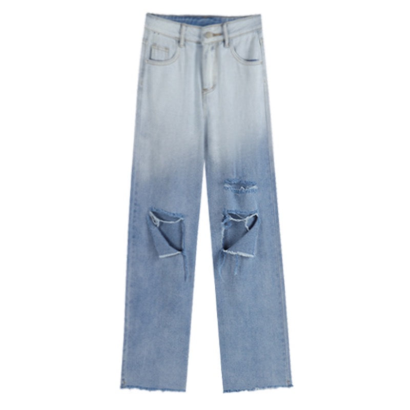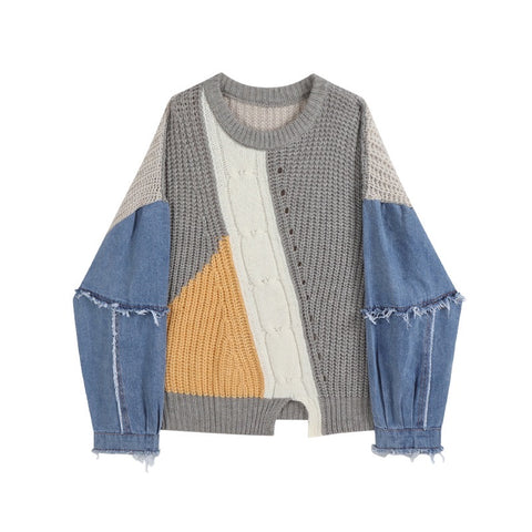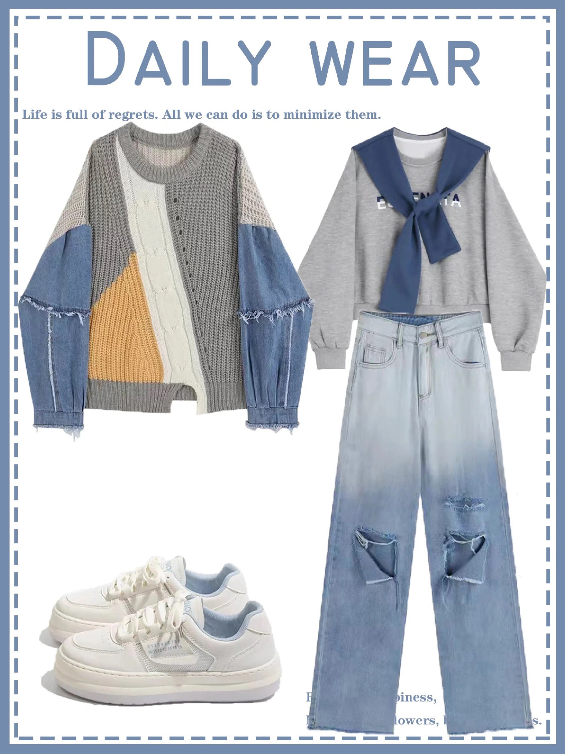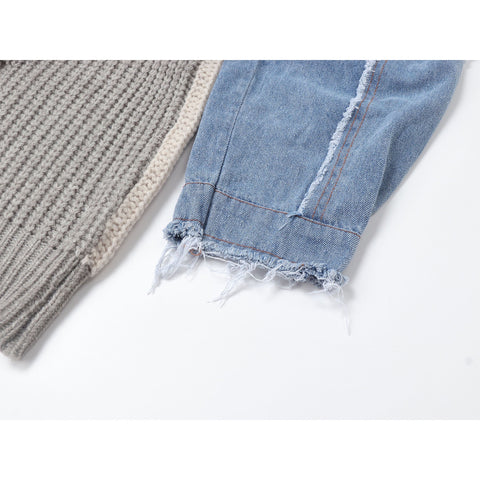 デニム切替セーター韓国風ゆったりオシャレなカラー対比感ニッチニット ラウンドネックロングタイプグレーショールコート hiphopハイストリート風グラデーションデニムロングパンツ夏新作個性的穴あきハイウエストワイドパン番号ZT60