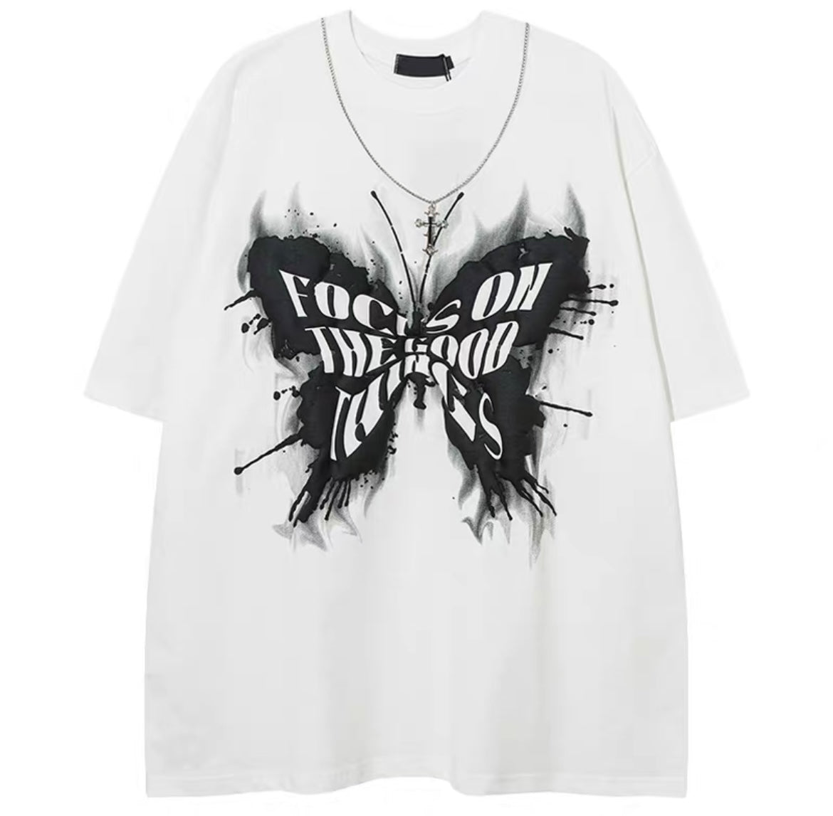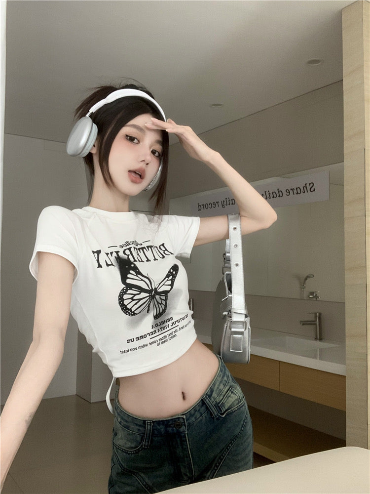 ハイストリートvibe蝶発泡プリントペアルックTシャツ半袖夏ファッションブランド半袖 バタフライアルファベットプリント半袖Tシャツ女性夏スパイシー妹風スリムショートタイプへそ出し上着番号ZT253