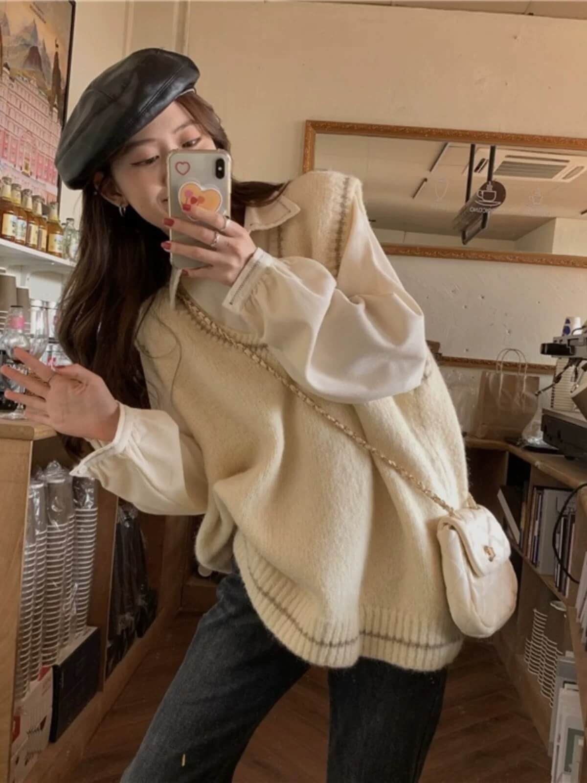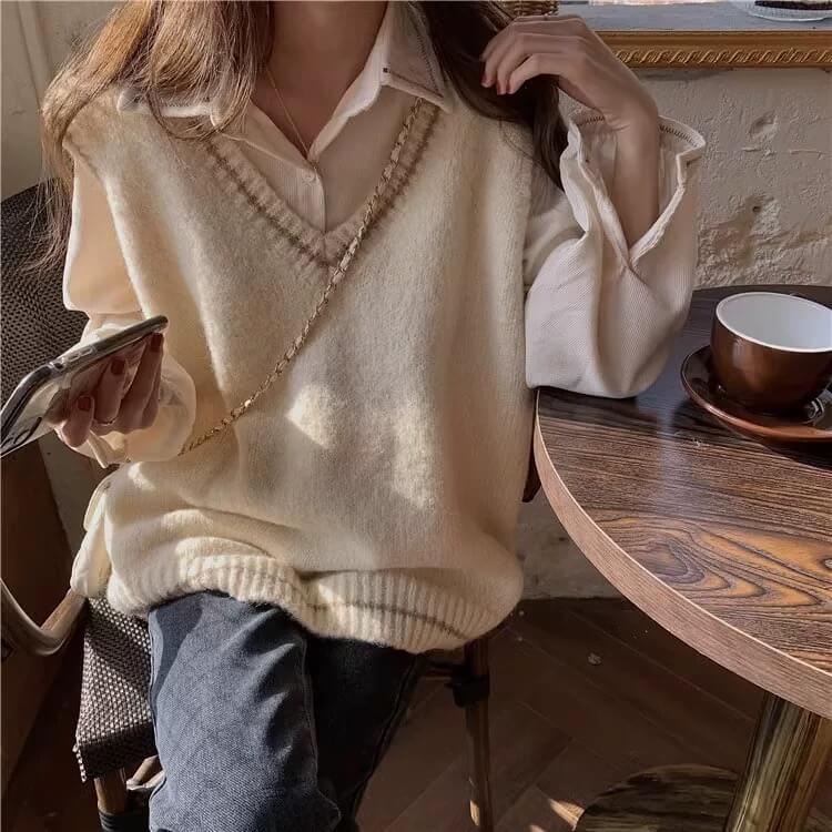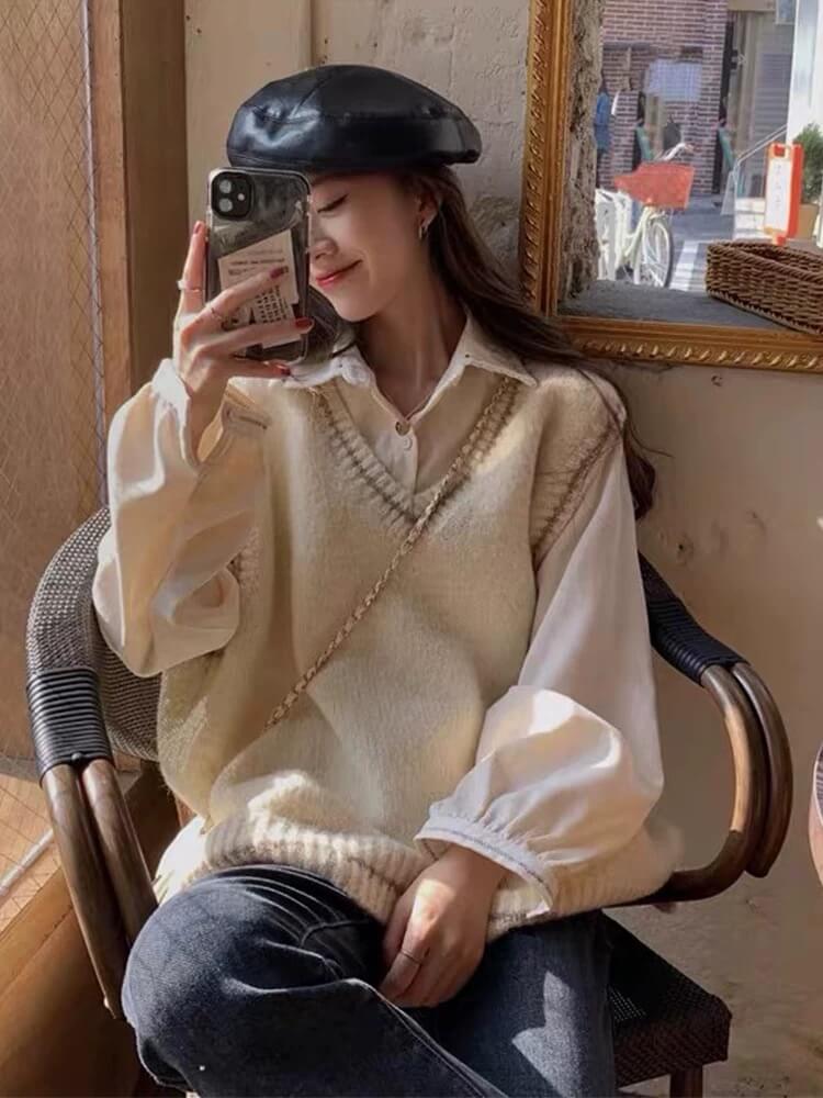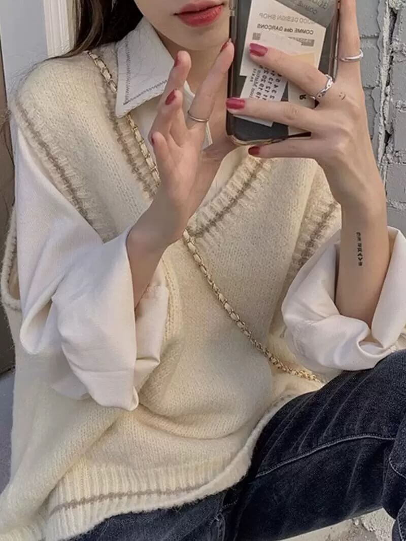 ファッション百搭のゆったりシンプルVネックニットベスト/クラシックシンプルな白いシャツ番号ZT712