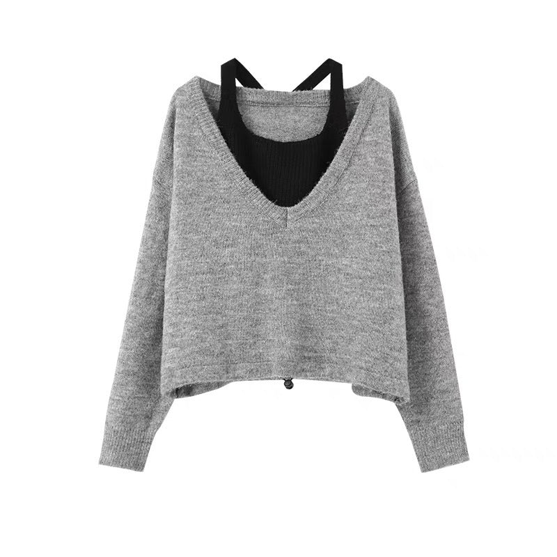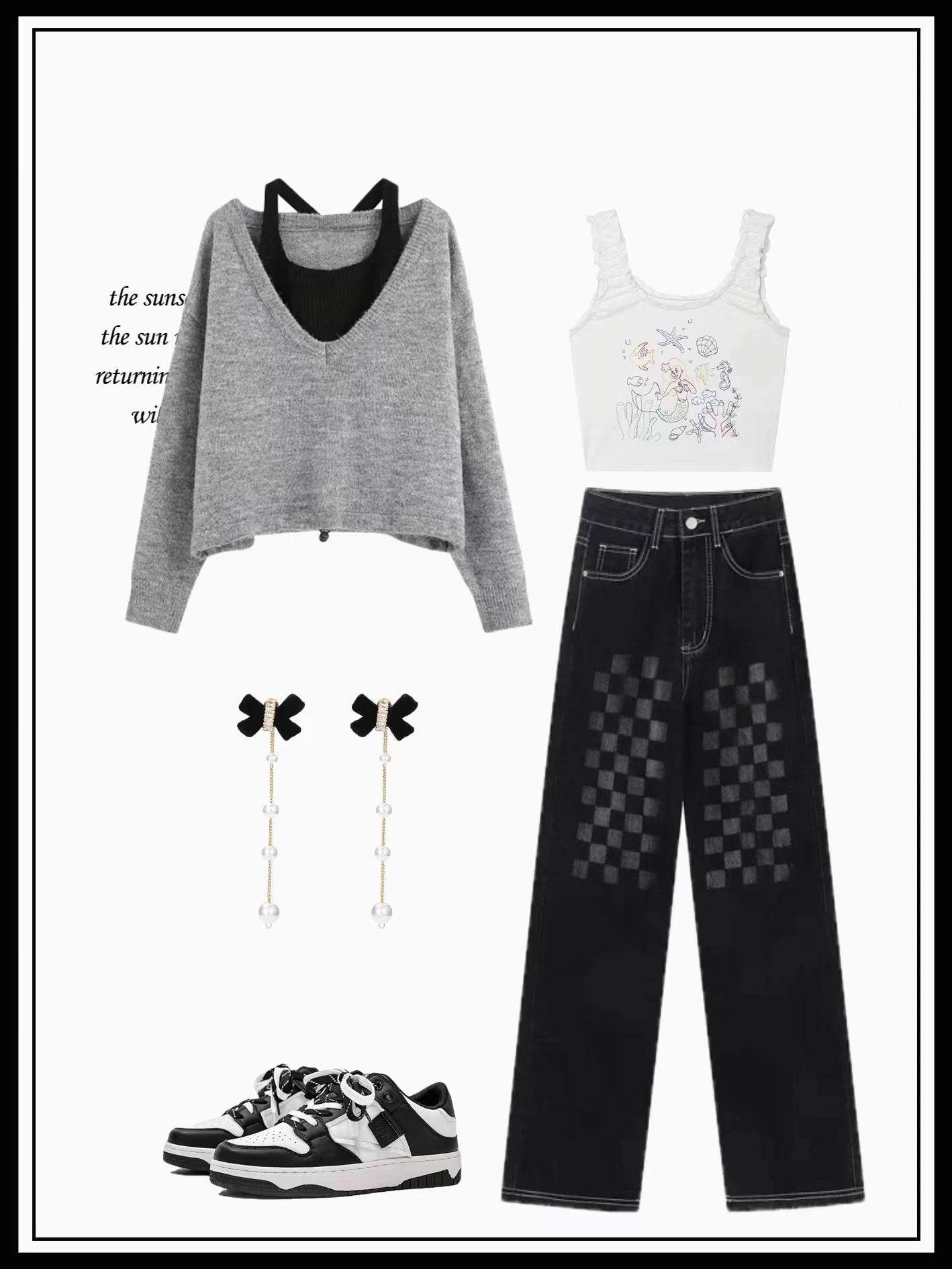 フェイクレイヤードVネックグレーセーター新作2023秋冬怠惰風デザインニットシャツ上着 モップジーンズ女性春ストレートゆったり個性的な碁盤目デザイン感覚ワイドレッグロングパンツ 人魚刺繍キャミソール女性夏新作ボレロ番号ZT468