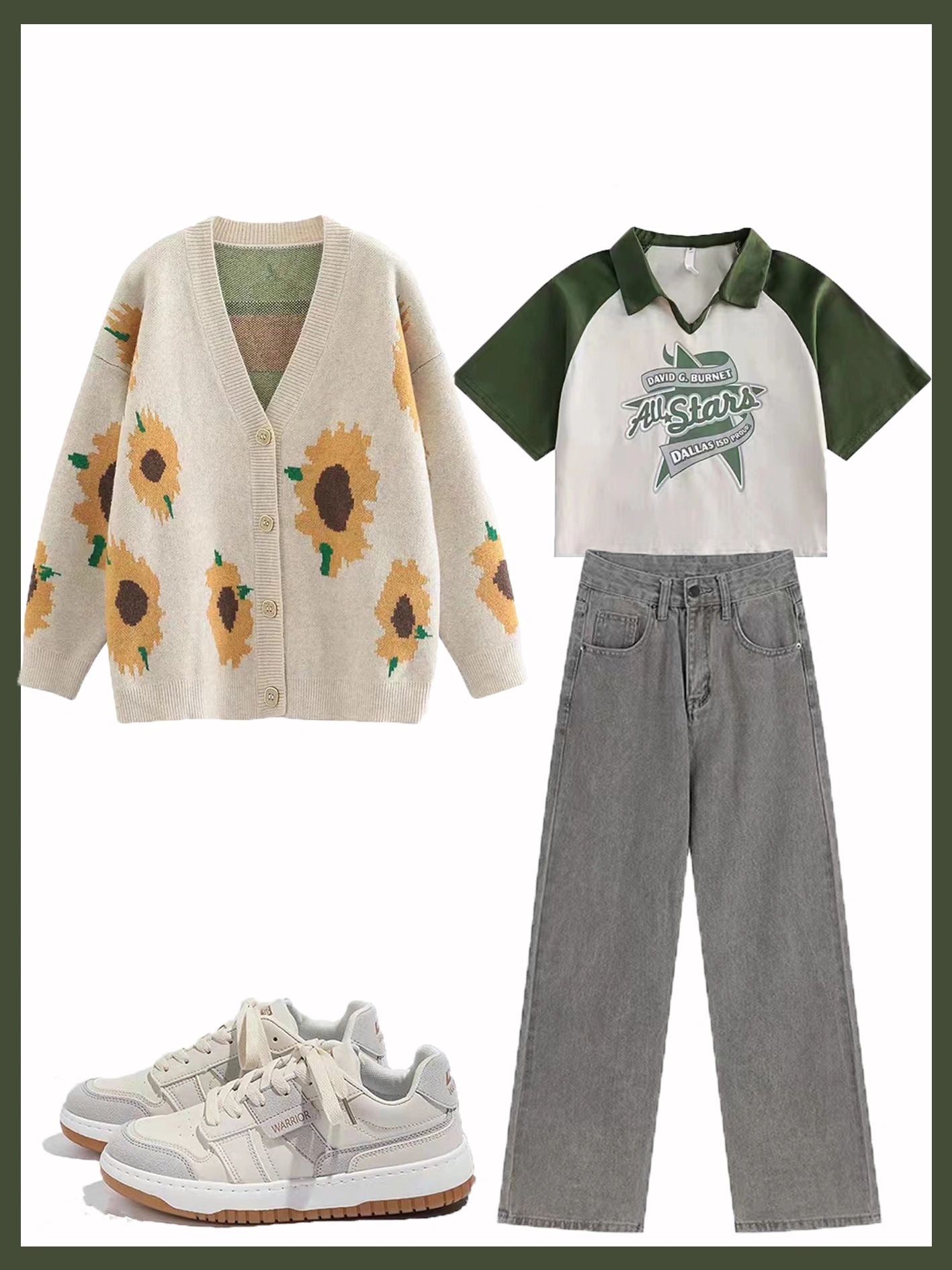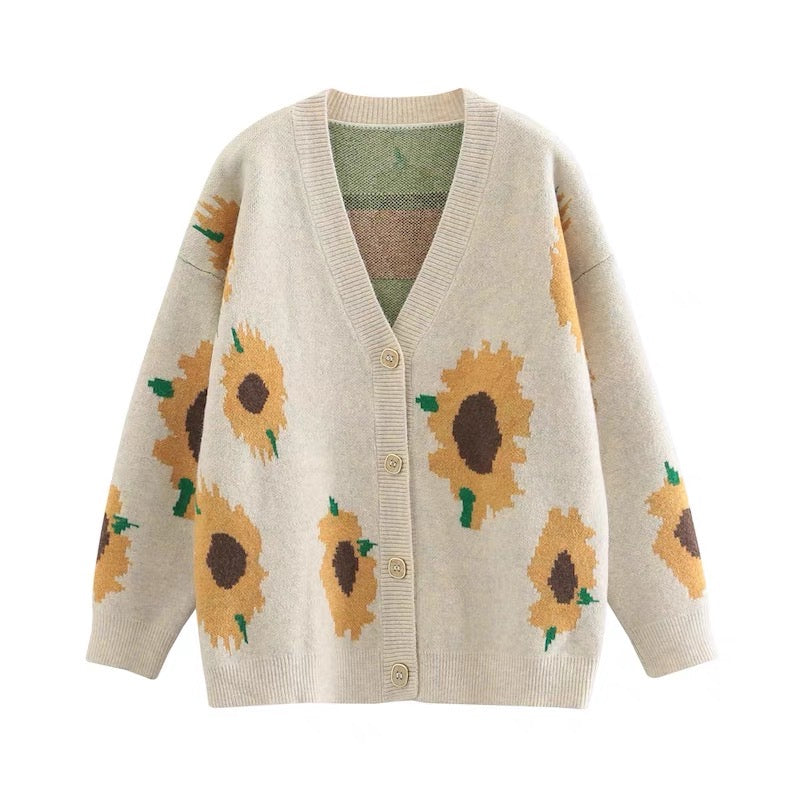 フレンチヴィンテージひまわりジャカードVネックニットカーディガン女性秋ゆったりセーターコート番号ZT623