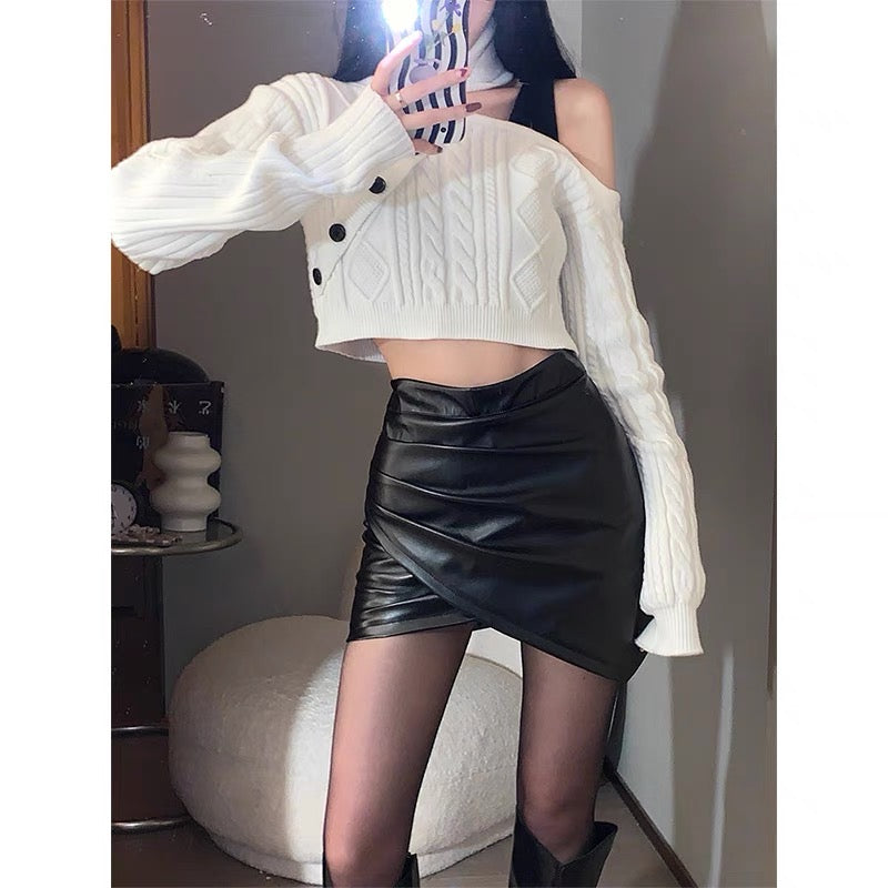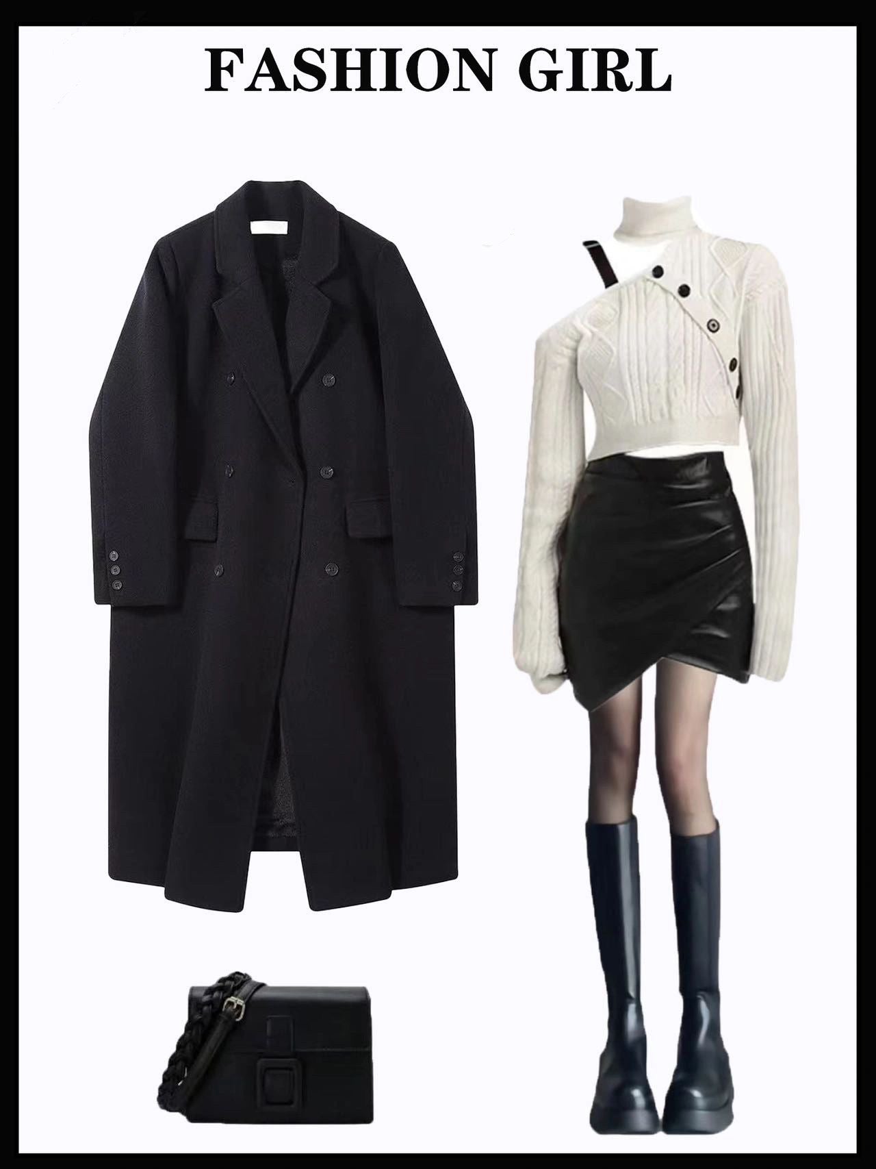 ブラックコートレディーストレンチコートラシャコートスーツロング丈ラシャ冬コートオシャレハイネックオフショルダーホワイトセーター女性秋デザインショートタイプ斜め肩ソフト長袖ニットギャザー小革スカートデザインPU革スカート女性春秋セクシー不規則A字ハイウエストバッグヒップスカート番号ZT532