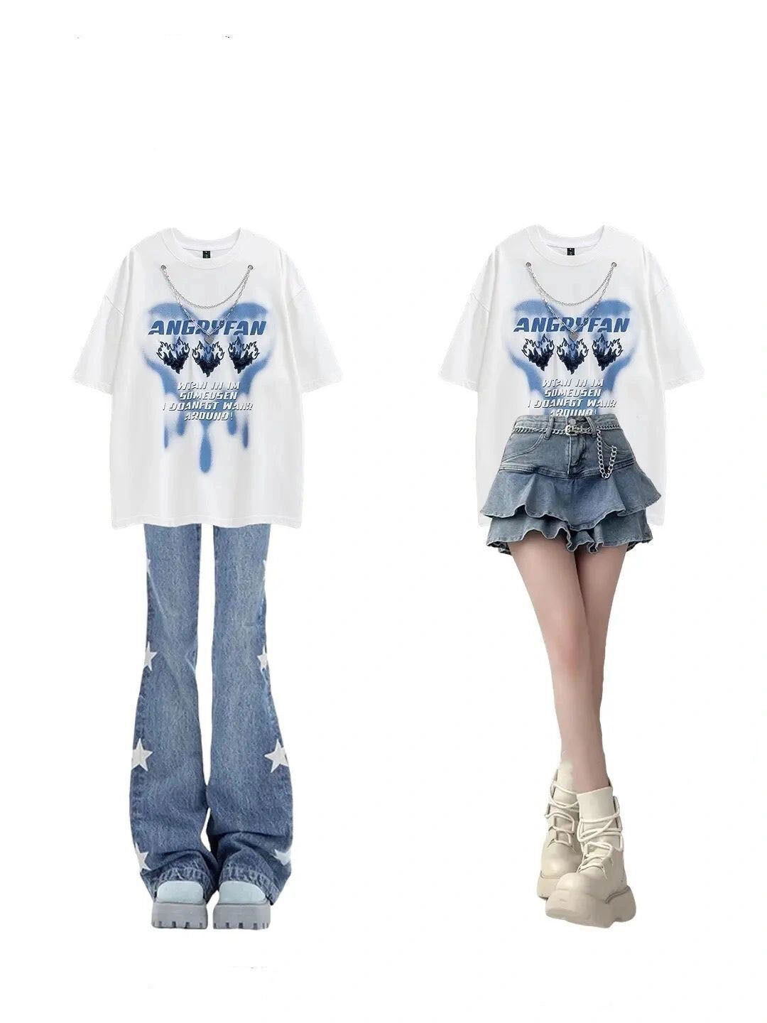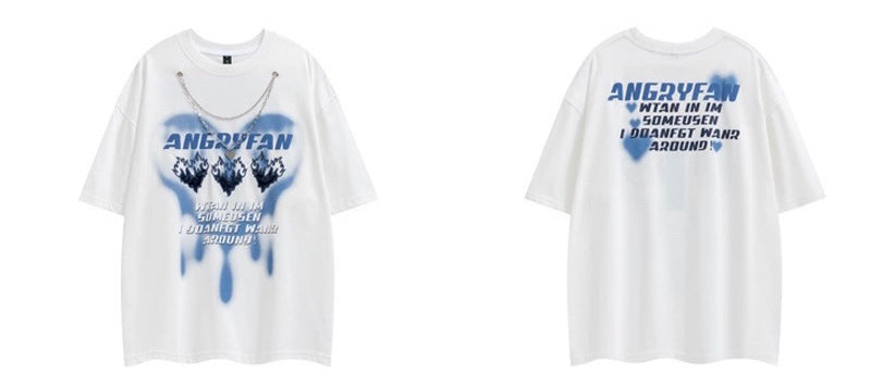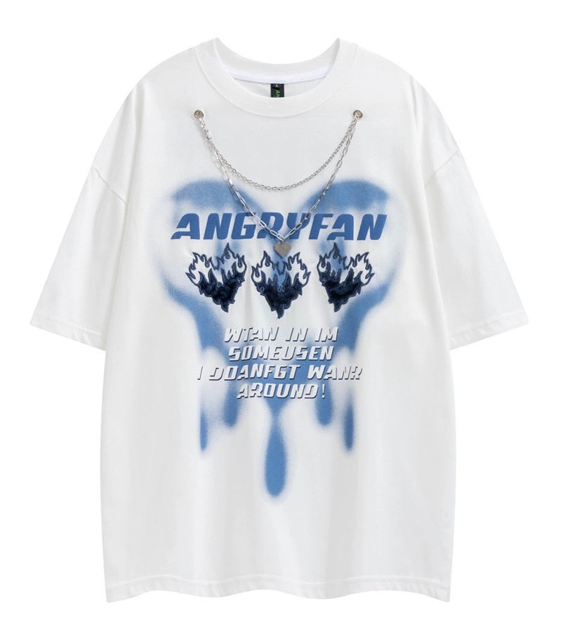 プリント半袖ネックレスアメリカンファッションoversizeカップルゆったりTシャツ純綿/夏着痩せジーンズ女性アメリカ風ビンテージ風ギャルスタープリントデザイン小粋フレアースリムパンツ番号ZT396