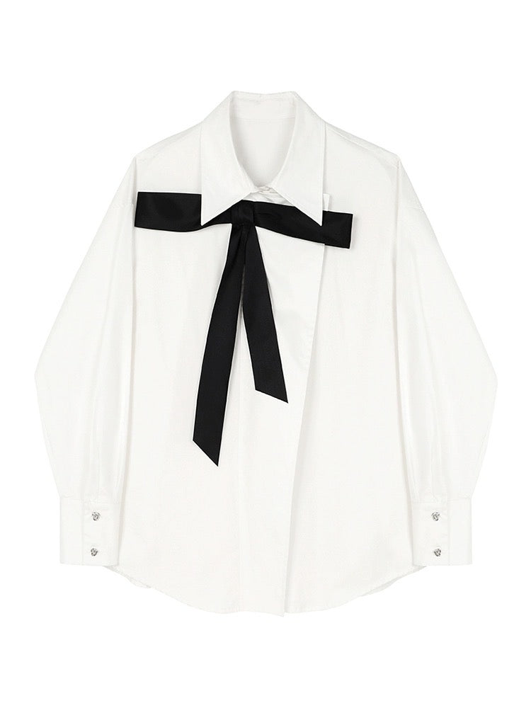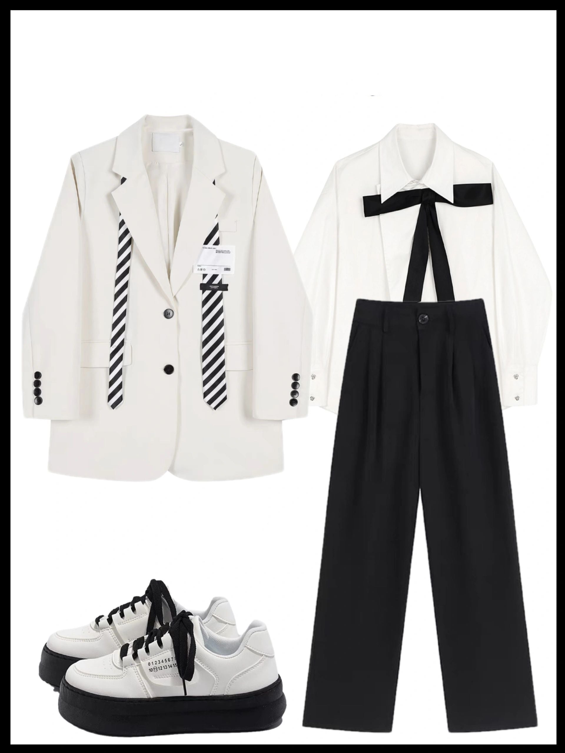 ベージュのテーラードジャケット女性春秋新作高級なデザイン感ニッチな色切替のストリートスーツ リボンシャツレディースデザイン感韓国風ゆったりフレンチシックホワイト長袖シャツ番号ZT443