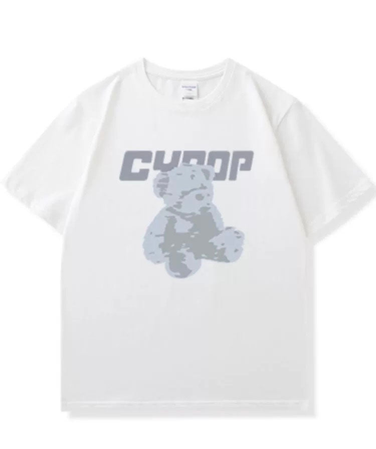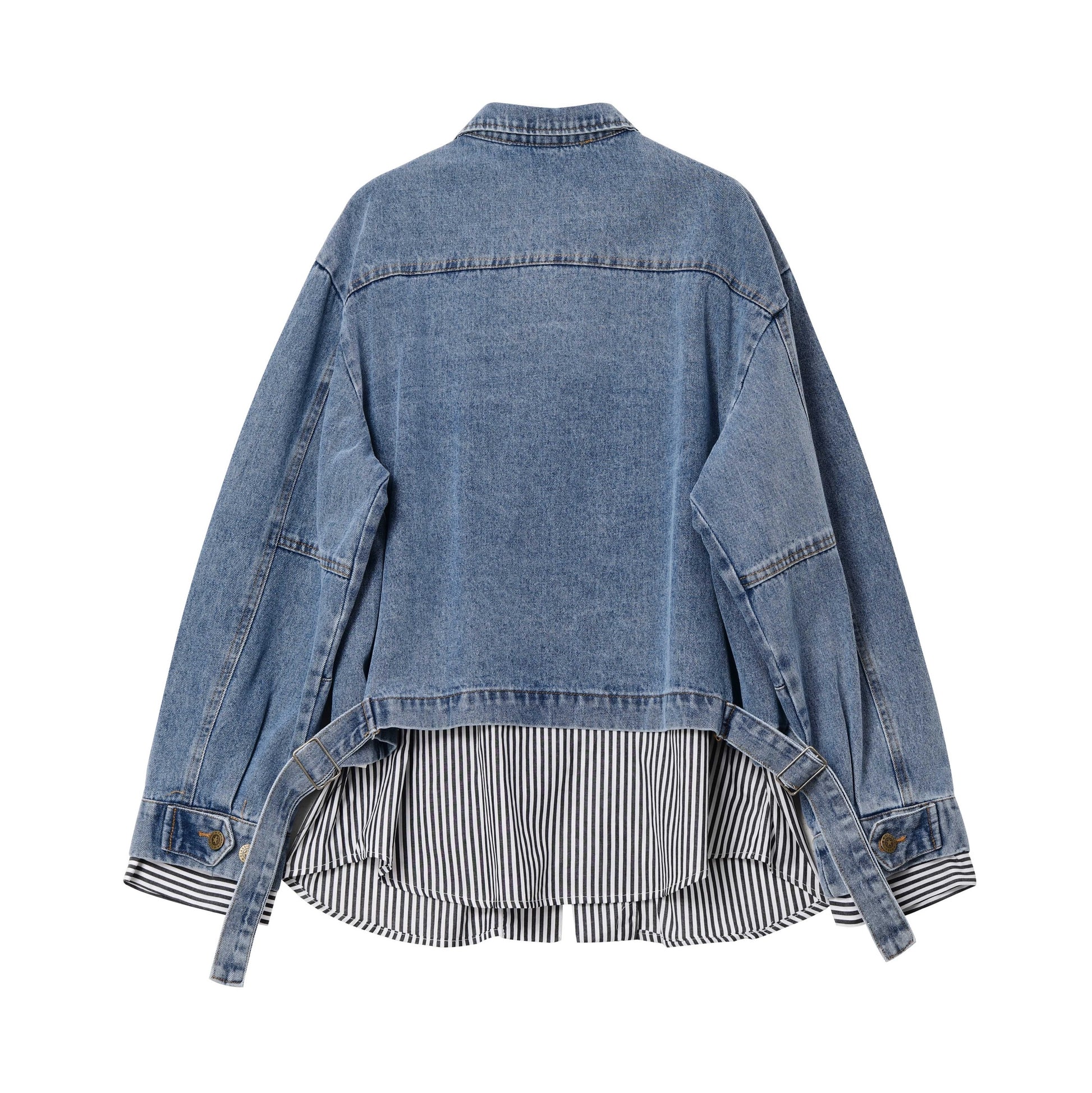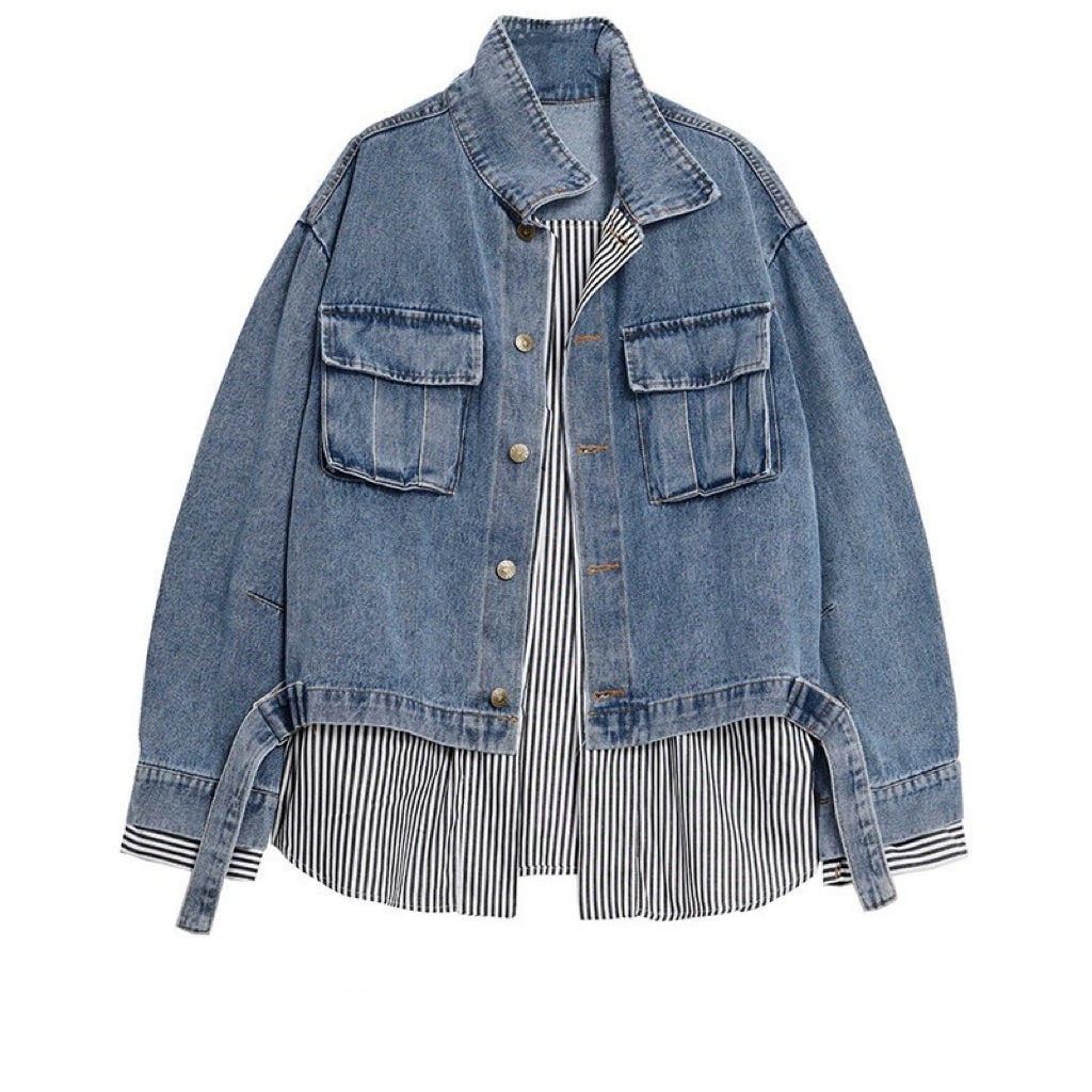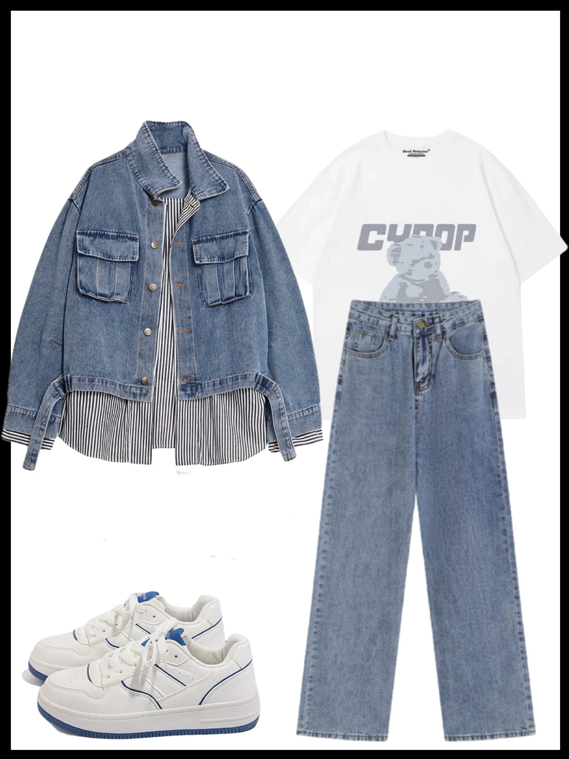 レディースブルーデニムジャケットレディースストライプ切替ジャケットフェイクレイヤード/熊ちゃん半袖Tシャツレディース新作insトレンドアメリカ風ゆったりトレンド夏純綿カップル上着/ハイウエストワイドレッグジーンズ女性新作着痩せ高ドレープ感ゆったりストレートパンツ番号ZT343