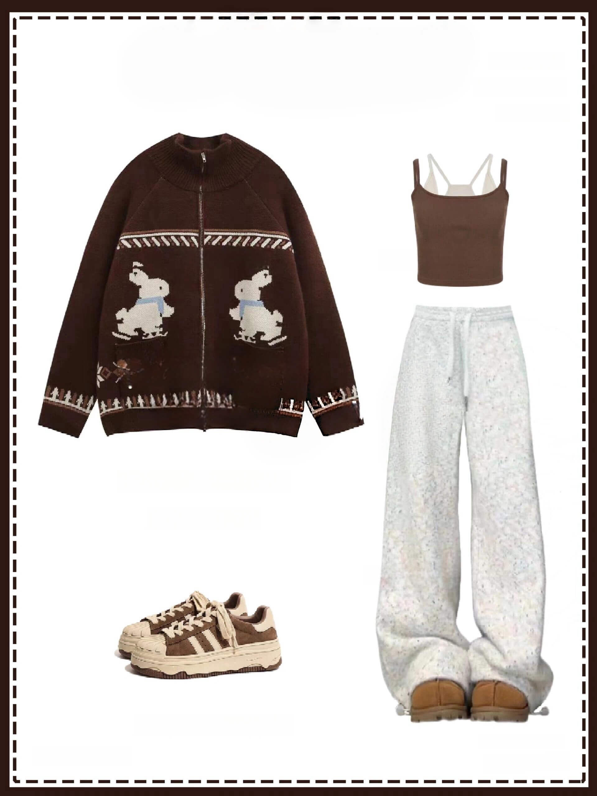 レトロカートゥーンニットカーディガン レディース 春秋冬 ジップアップ ゆったりシルエット/ミルキーホワイト スウェットパンツ レディース ゆったり ワイドシルエット カジュアルコーデ番号ZT733