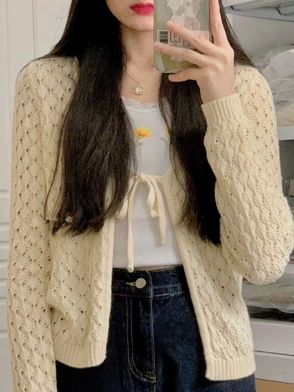 レース付ショートタイプタンクトップセクシーキャミソールアプリコット透かし編ニット長袖夏/ショートタイプ細いキャミソール女性2023スリム着痩せインナーウエストZT356