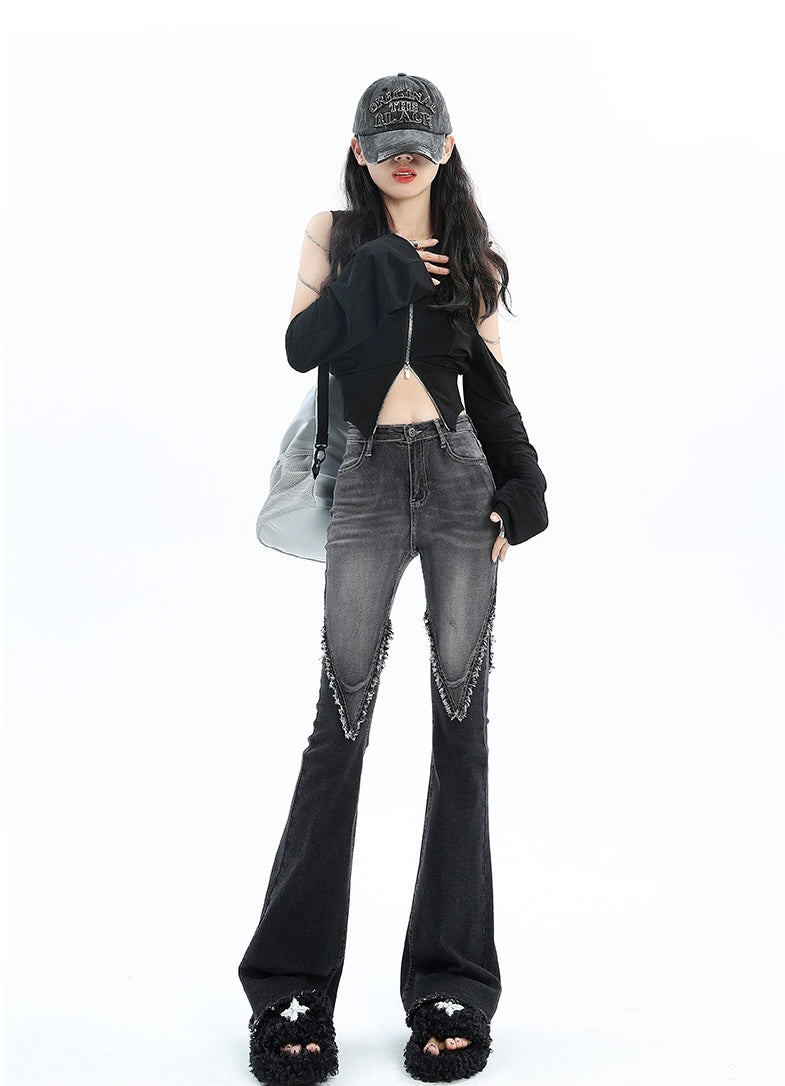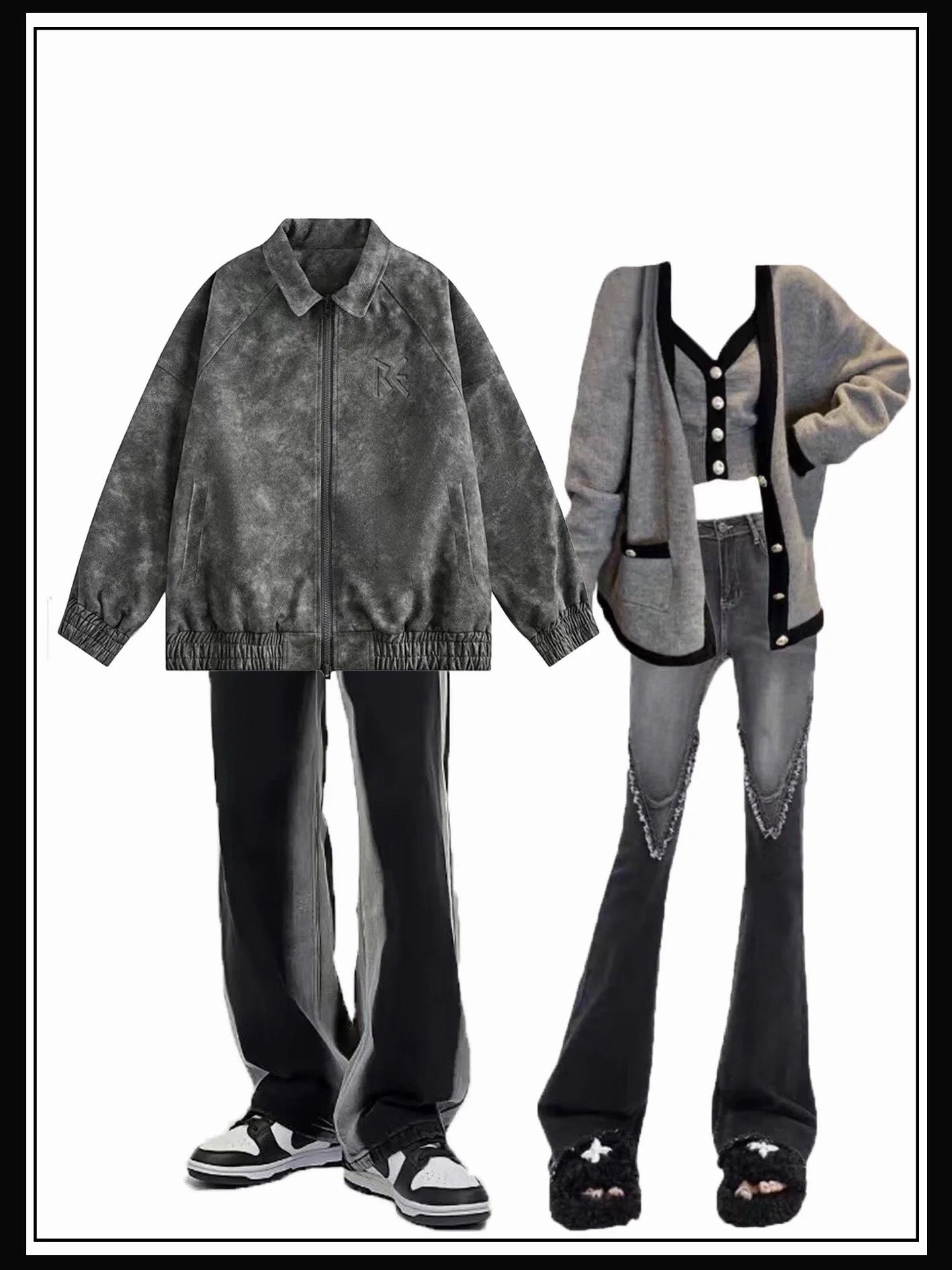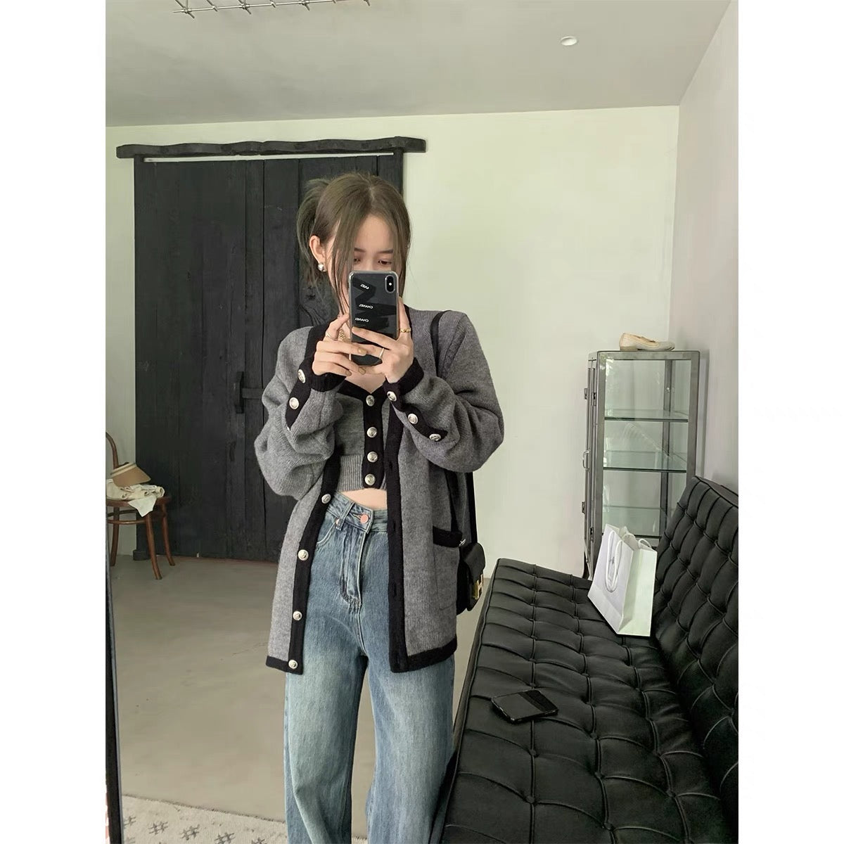 ヴィンテージジャケットゆったりペアコート カットソータンクトップカーディガン2枚組女性春秋スタイル重ね着風トップス デニムロングパンツハイウエストストレッチフレアパンツグレー高級感フリンジ切替番号ZT303