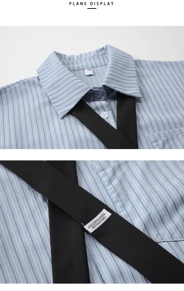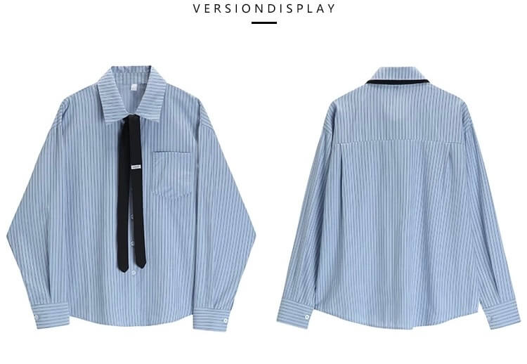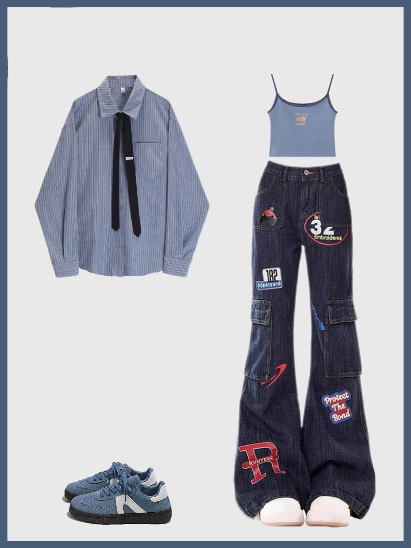 ヴィンテージストライプ オーバーサイズシャツ+ネクタイデザイン | スクールスタイル 万能長袖シャツ/アメリカンヴィンテージ パッチワーク ワークデニムパンツ | ハイウエスト ワイドレッグ Y2Kストリートファッション番号ZT709