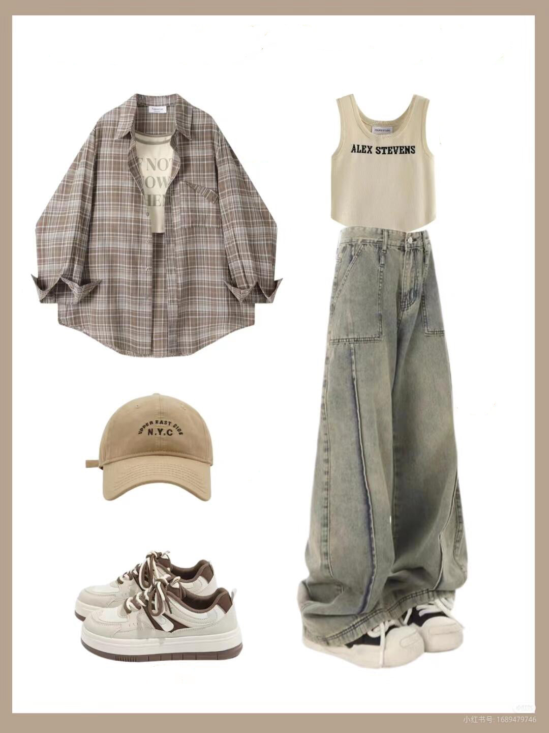 ヴィンテージチェック柄オーバーサイズシャツジャケット+キャミソール 2点セット|韓国風カジュアルストリート 春秋ライトアウター/ヴィンテージウォッシュ オーバーサイズ ワークデニムパンツ | ハイウエスト フルレングス ワイドパンツ Y2Kストリートファッション番号ZT704