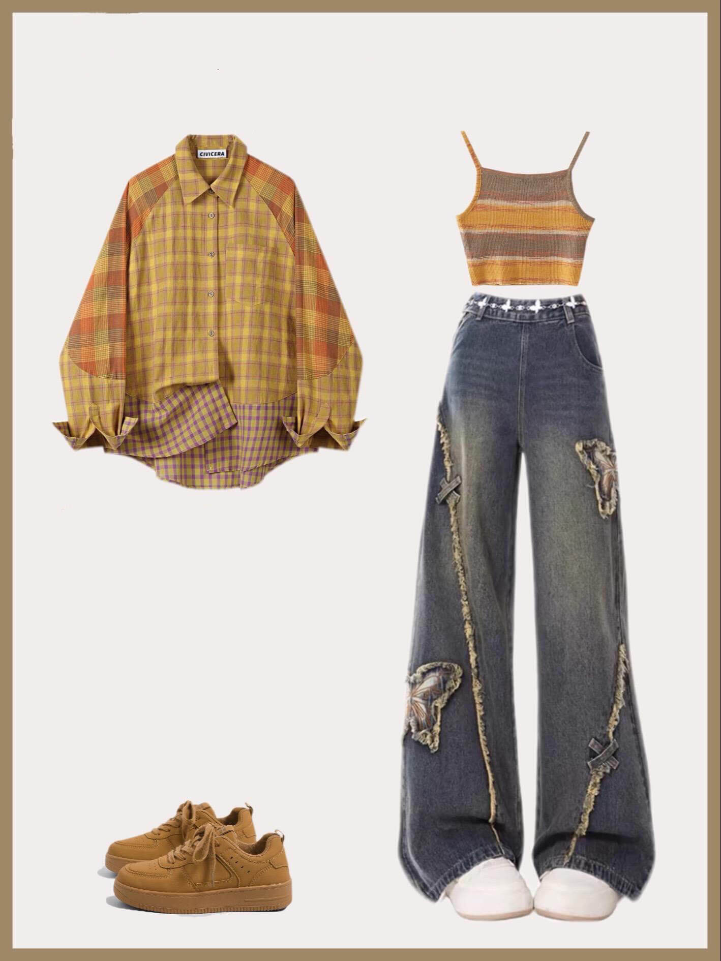 ヴィンテージパッチワークチェック柄 オーバーサイズシャツ | レトロカジュアル 韓国風ストリートジャケット/バタフライパッチ ダメージデニムパンツ | ハイウエスト ワイドレッグ ヴィンテージウォッシュ Y2Kストリートファッション番号ZT707