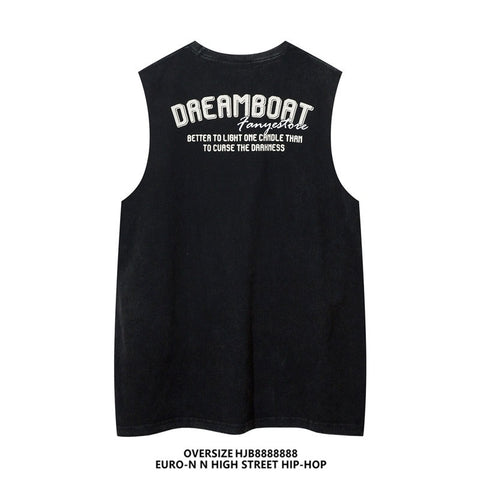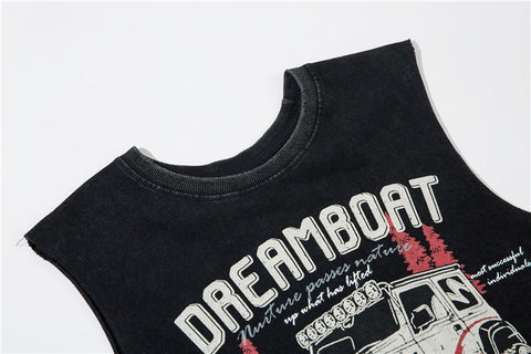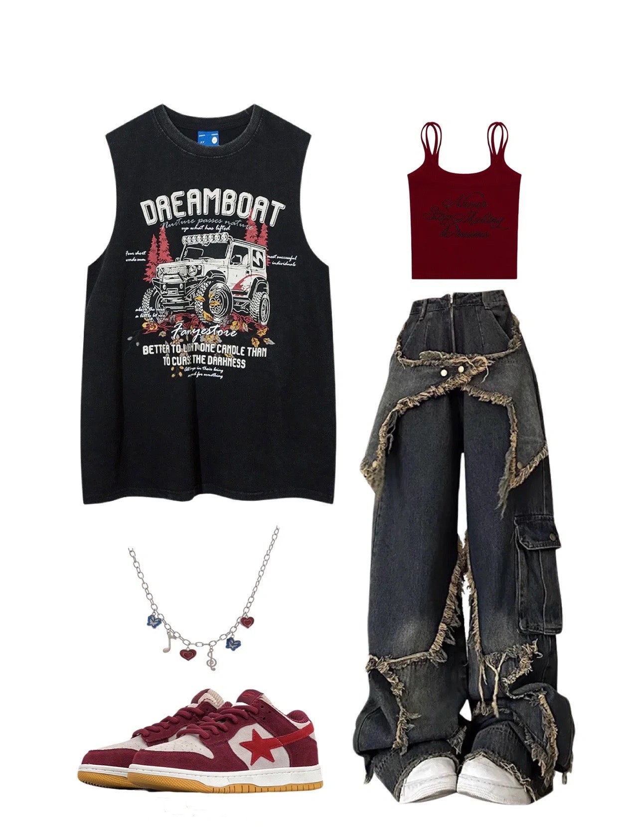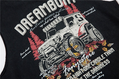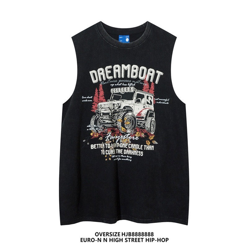 ヴィンテージ加工古いオフロード車アルファベットプリントタンクトップ アメリカ風のビンテージゆったりとした着痩せジーンズ裾丈ストレートパンツ番号ZT106