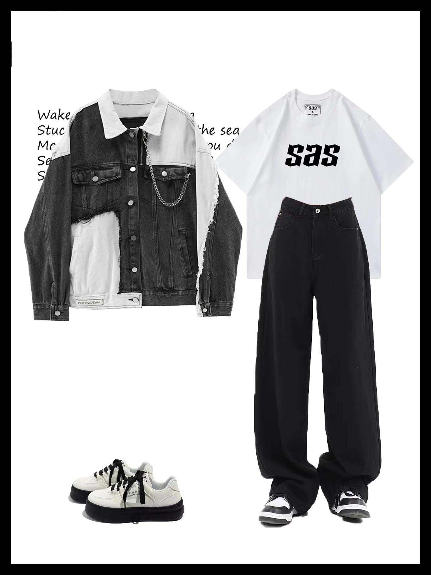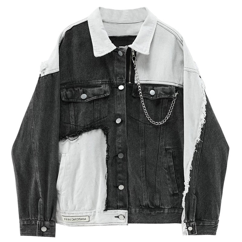 個性パッチワークダメージチェーン付きデニムジャケット - トレンド感あふれるストリート風ルーズアウター番号ZT692