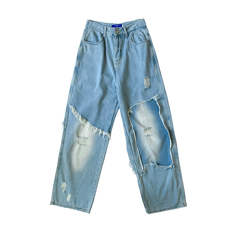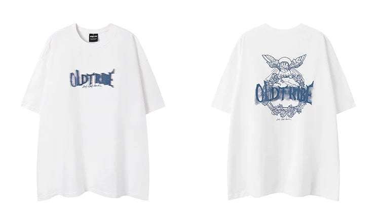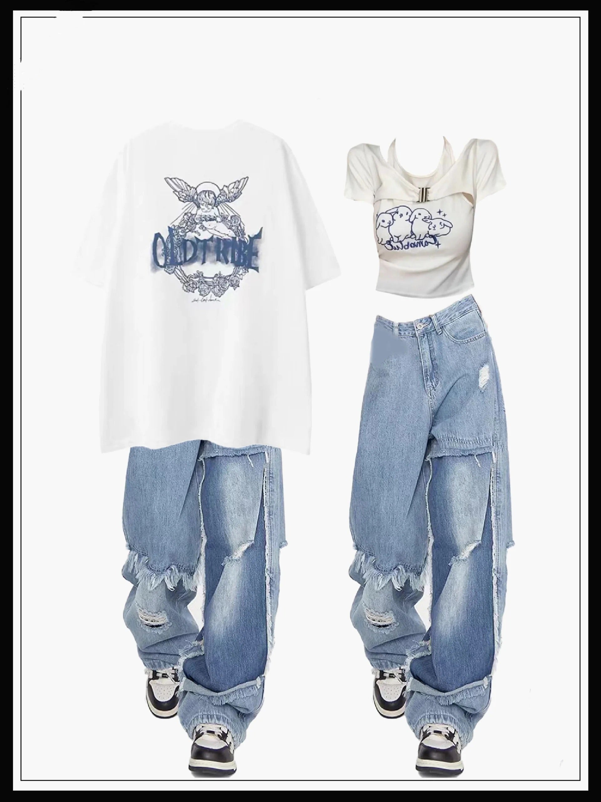 夏アメリカンヴィンテージハイストリートエンジェルプリント半袖Tシャツ/夏薄手アメリカンビンテージ風デザインワイド脚穴あきパンツ番号ZT286