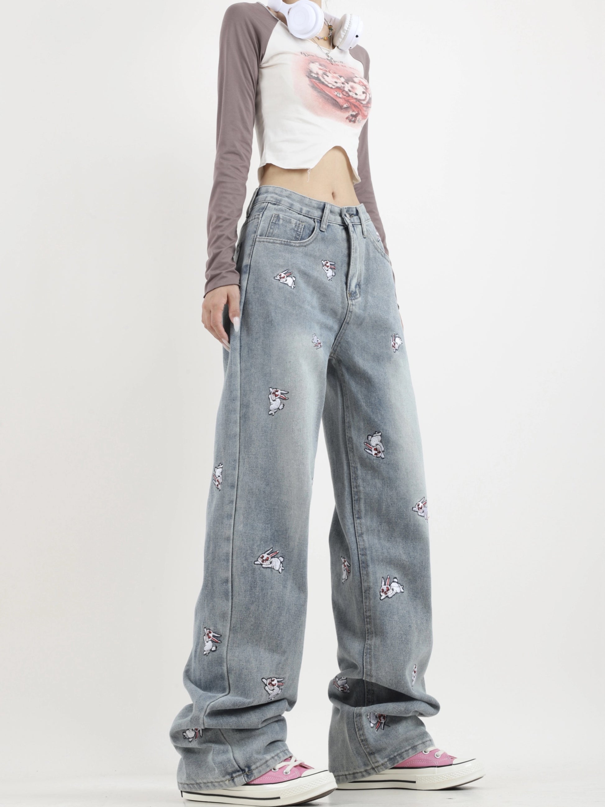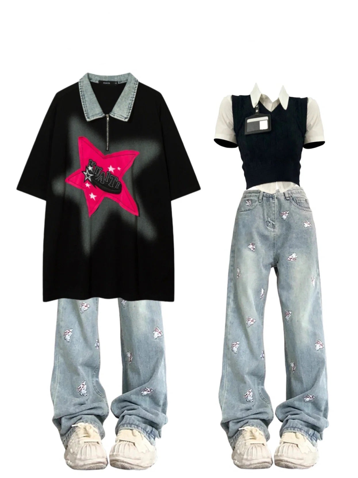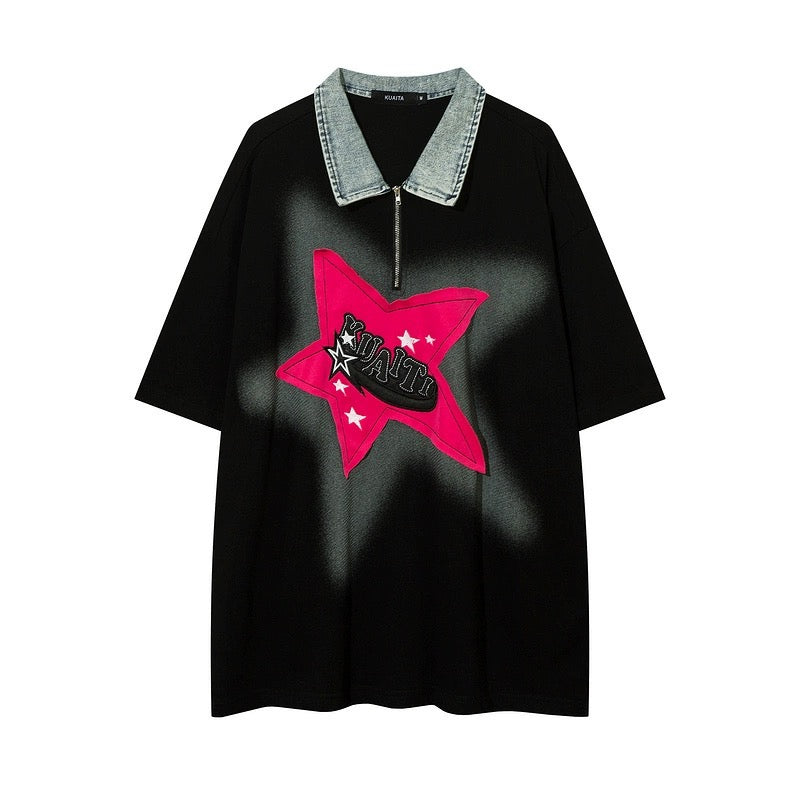 夏トレンド五角星パッチゆったりラペルPOLO半袖Tシャツ/夏Insビンテージ漫画ウサギ刺繍ゆったりジーンズ番号ZT212