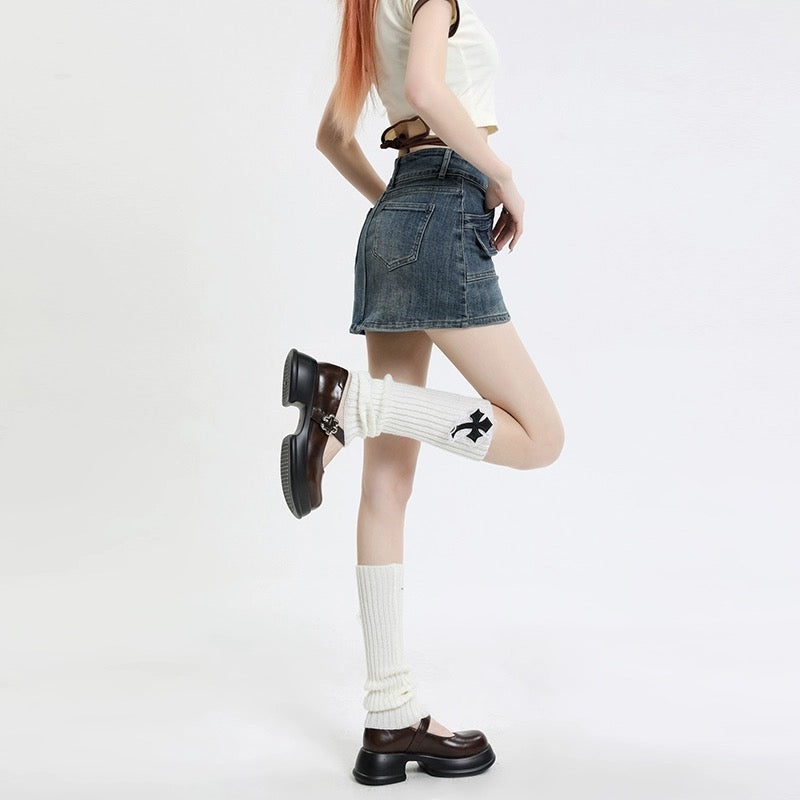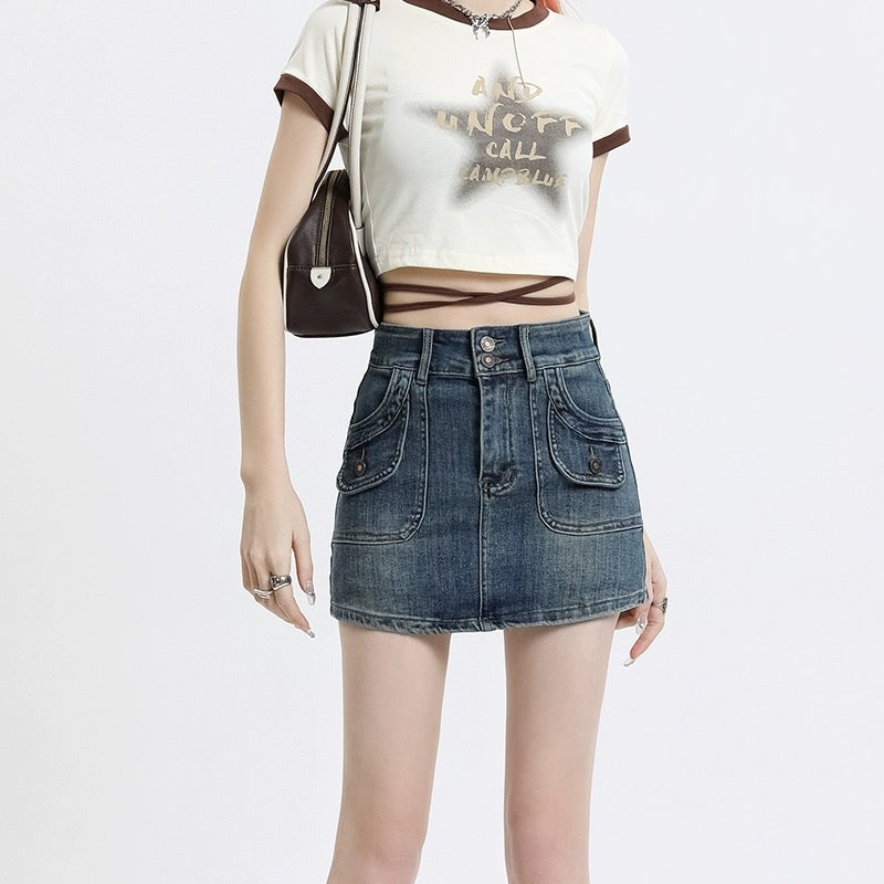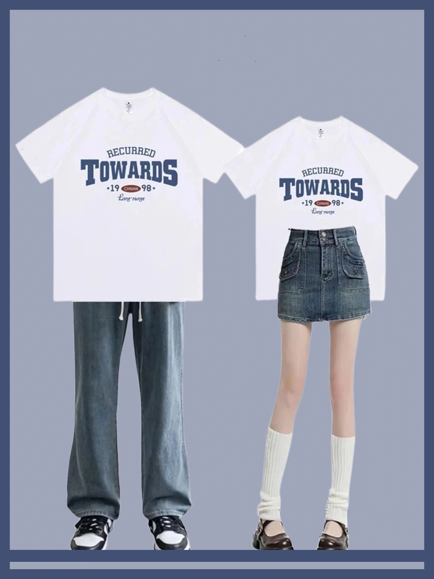 夏半袖Tシャツカップルトレンドプリントコーディネート自在丸首Tシャツ/アメリカンヴィンテージa字ミニスカート夏ハイウエストデザイン感ストレッチギャルヒップを包むミニスカートデニムスカート番号ZT354