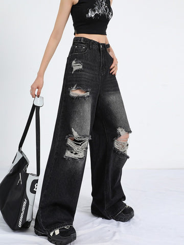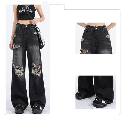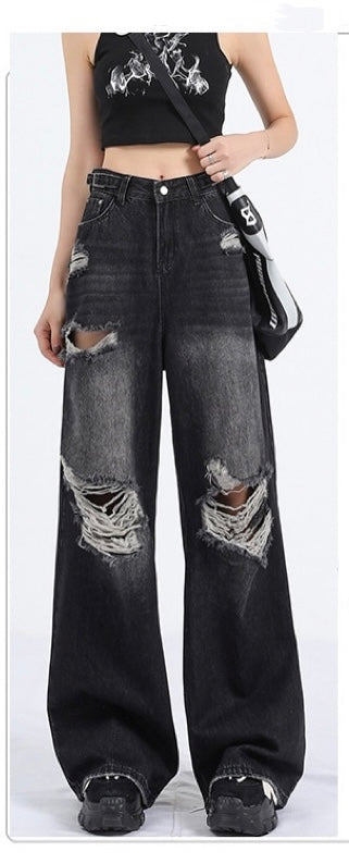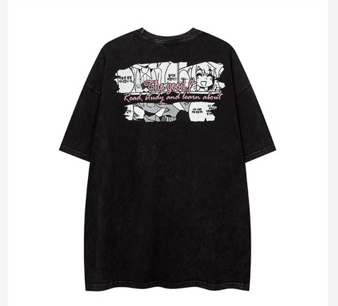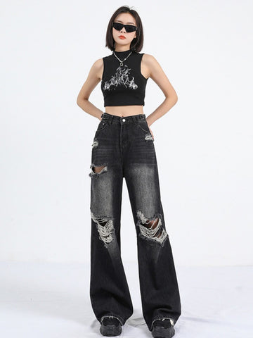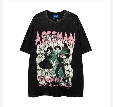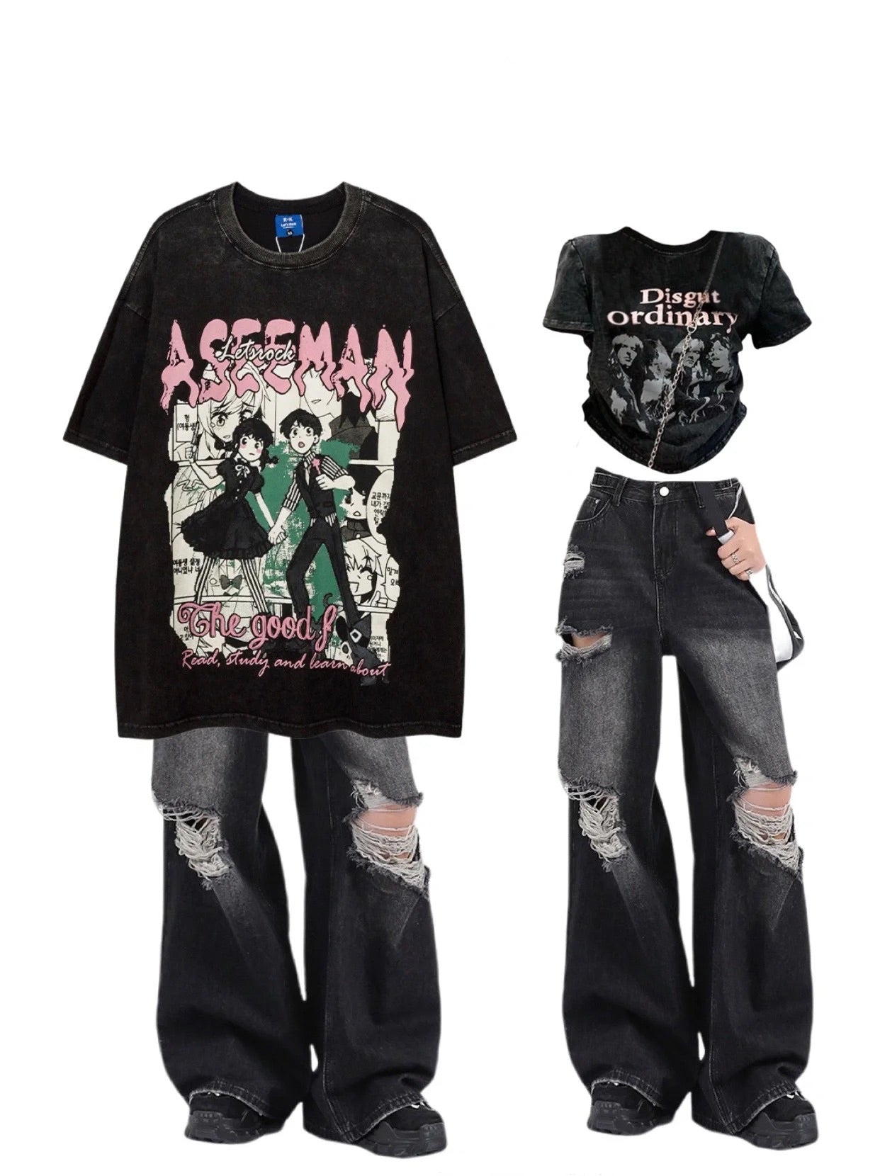 夏米風復古漫画柄プリントゆったりカップル半袖Tシャツ/夏ワイドレッグハイウエストジーンズ番号ZT77