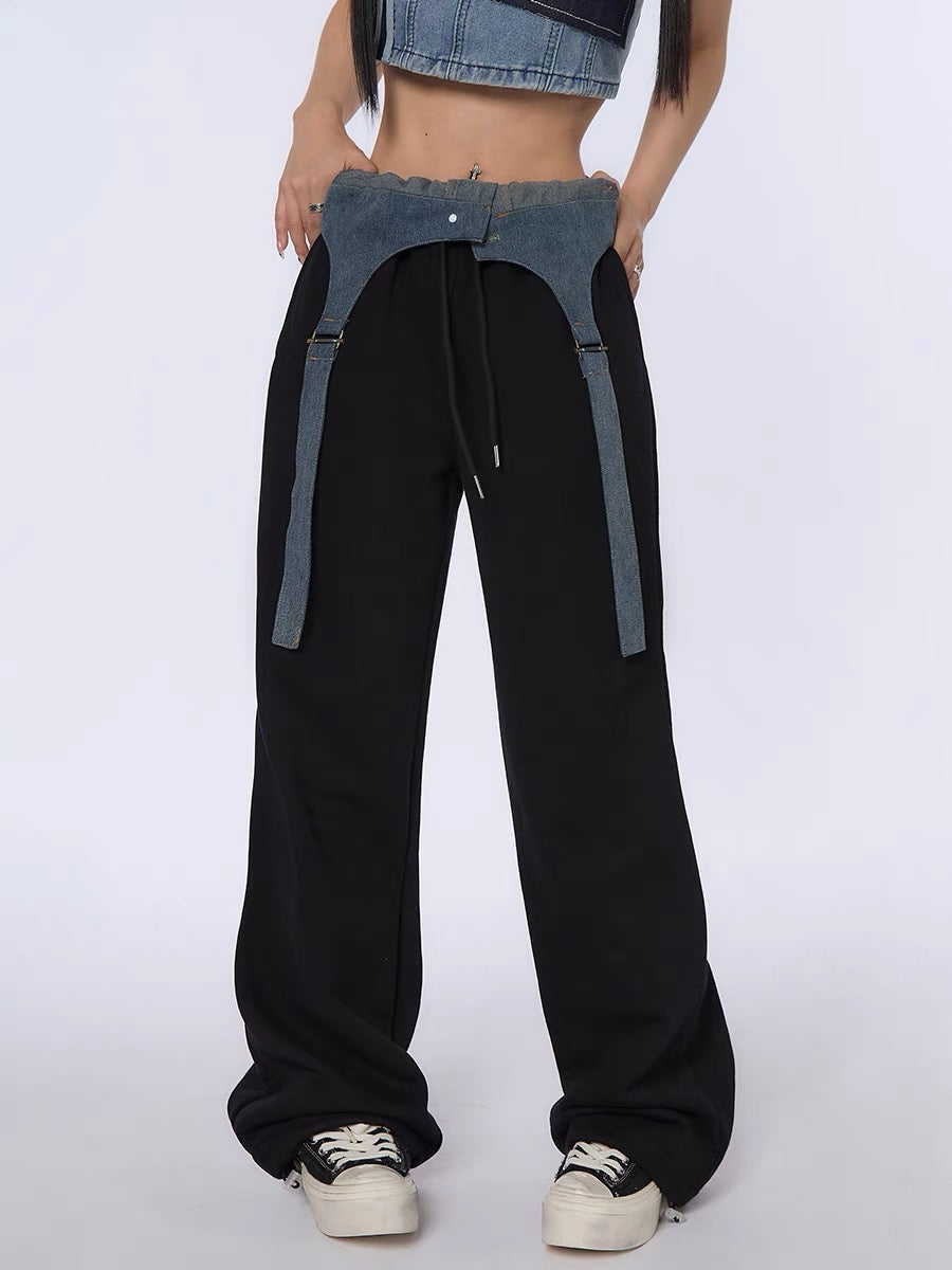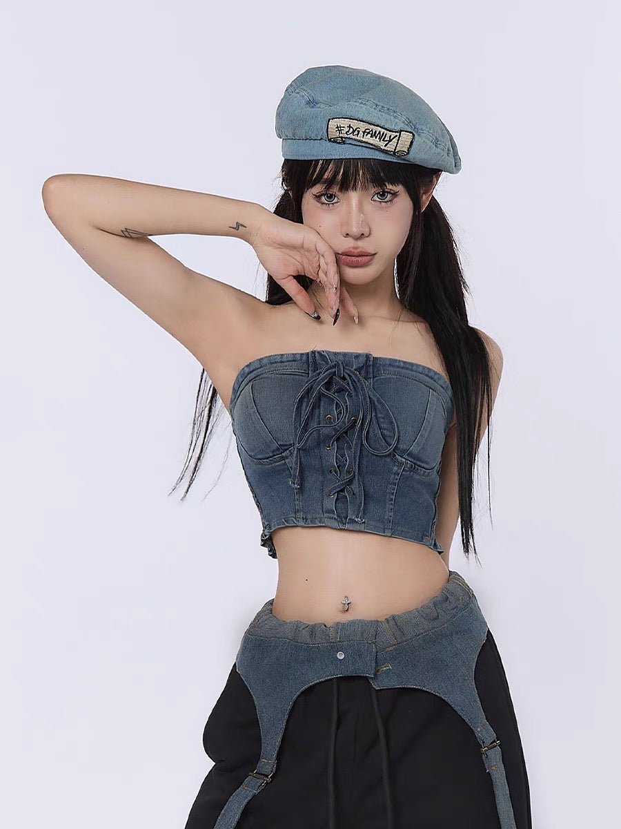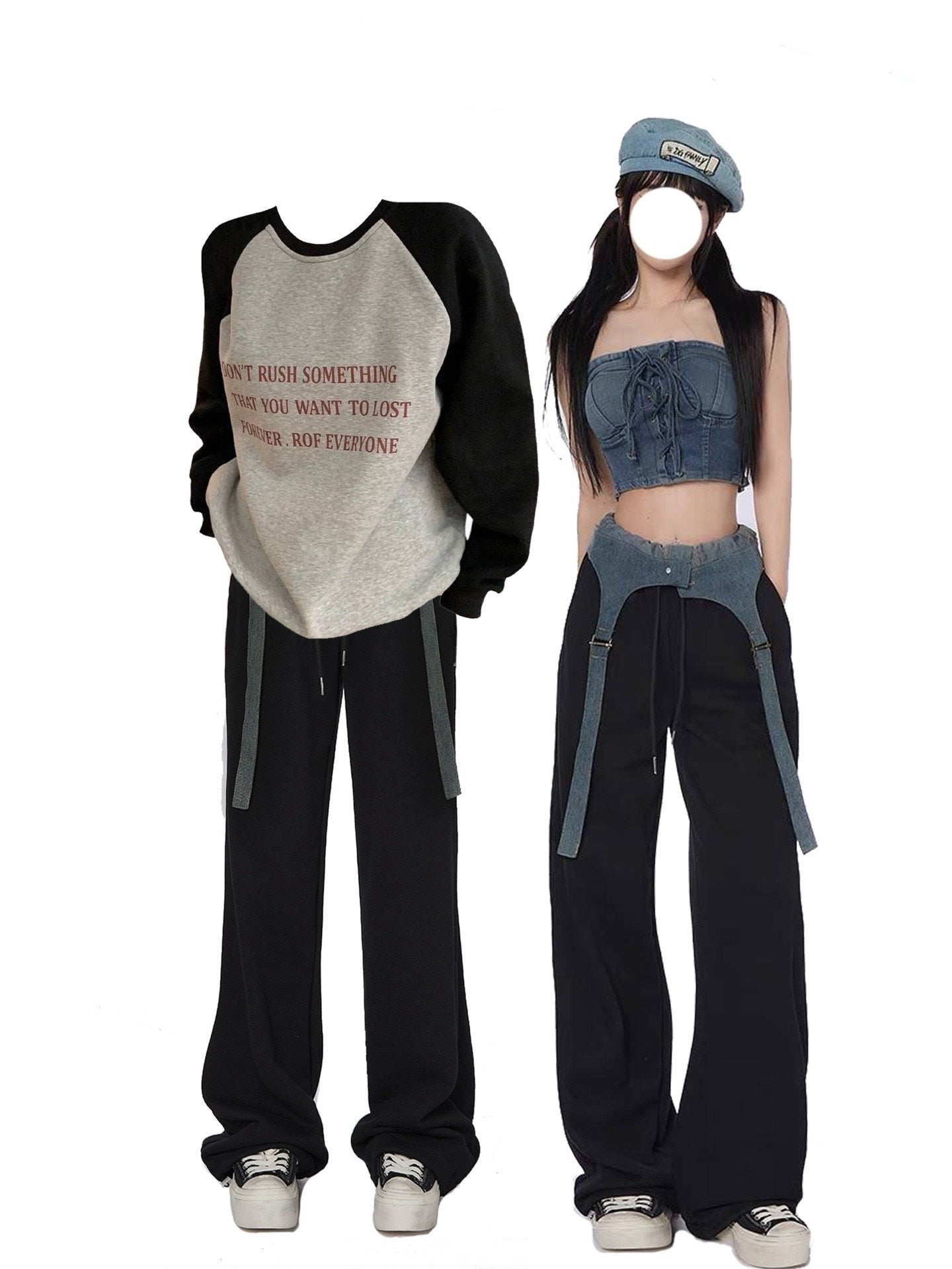 大サイズデブ妹アルファベットプリント女性タイプストリート上着 ギャル風キャミソールデニムキャミソール新作チューブトップタンクトップ デザイン性の高いデニム切替スウェットガーリーワイドパンツ番号ZT475