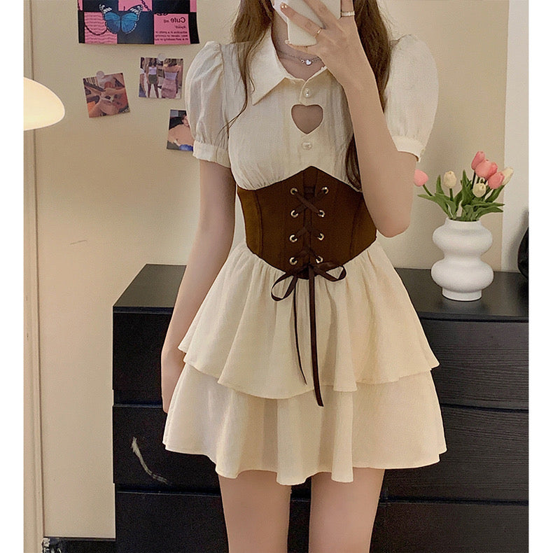 山系アウトドアニッチデザイン半袖Tシャツ男女純綿インナーシャツ パフ袖ウエストシェイプ新作ケーキスカートプリンセスワンピースハート型透かし彫りパフスカート番号ZT265