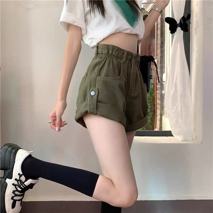 欧米ハイストリートアンティーク風ジャカードフレンチ独特のデザインvintage穴あきニット セルビッチデニムショートパンツ女性薄手アメリカ風ビンテージ高ウエストa字ゴムウエストミニカーゴパンツ番号ZT644
