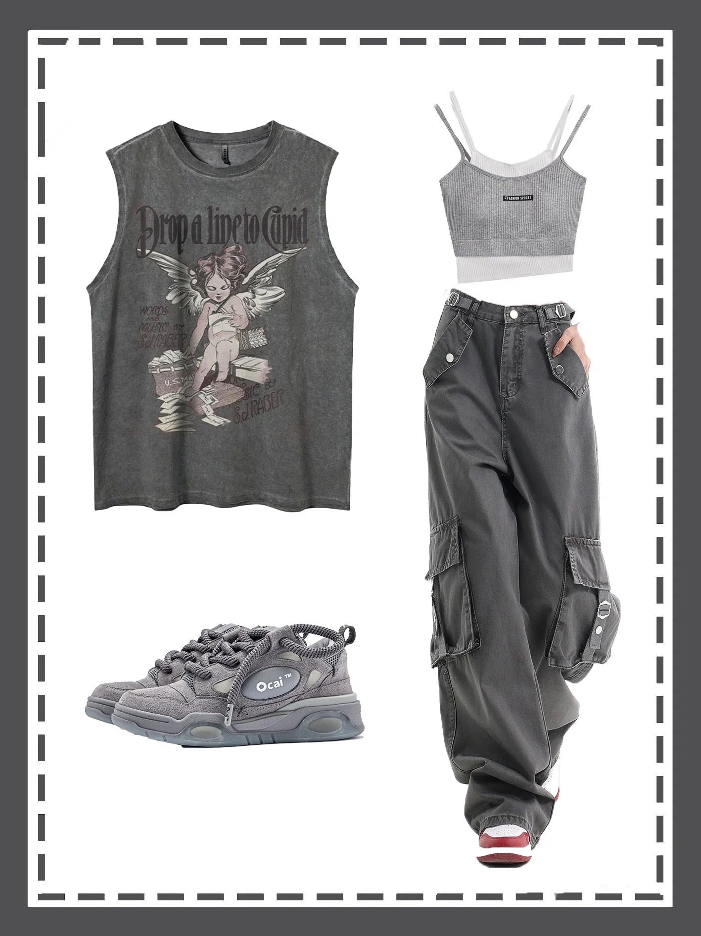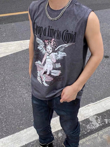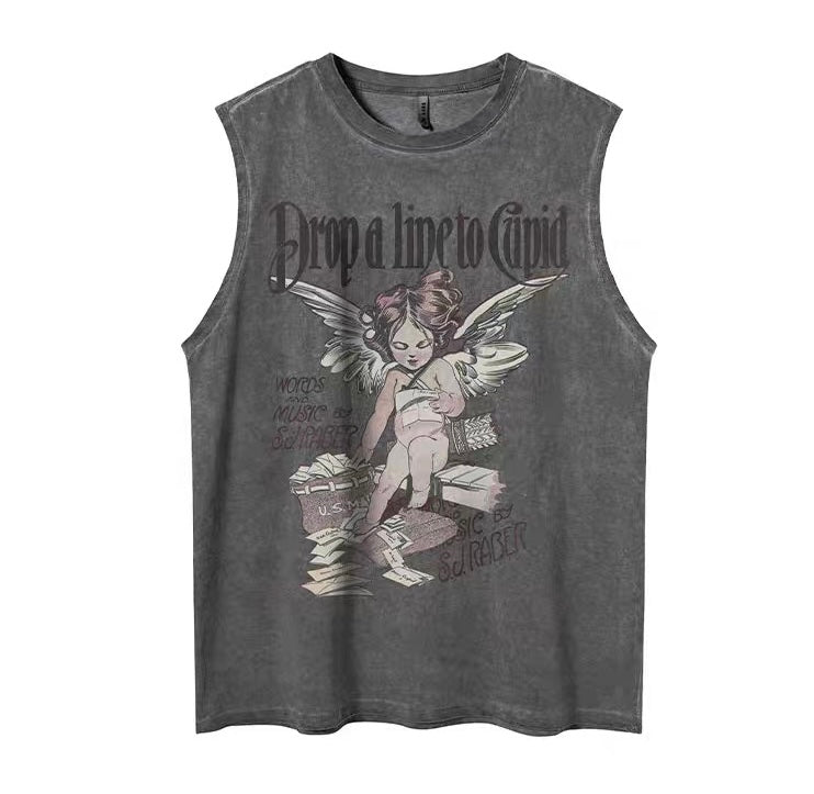 欧米復古の天使プリント丸首タンクトップTシャツ番号ZT223