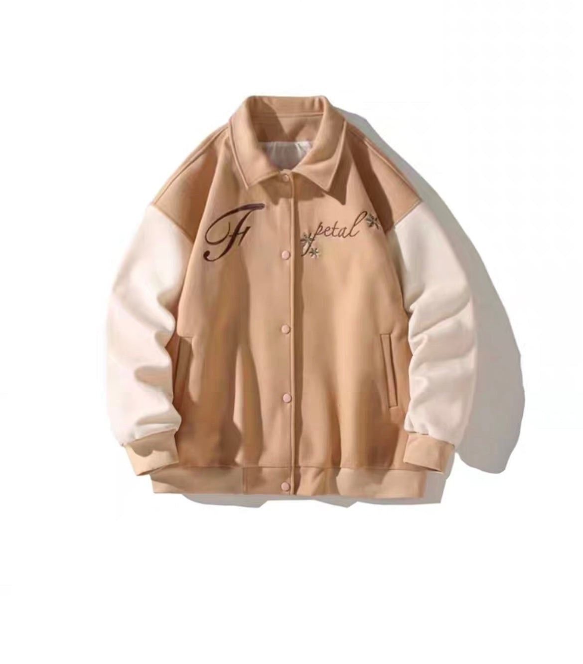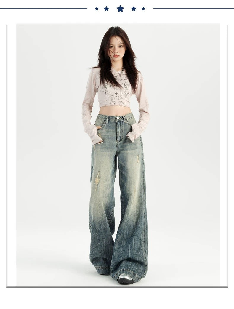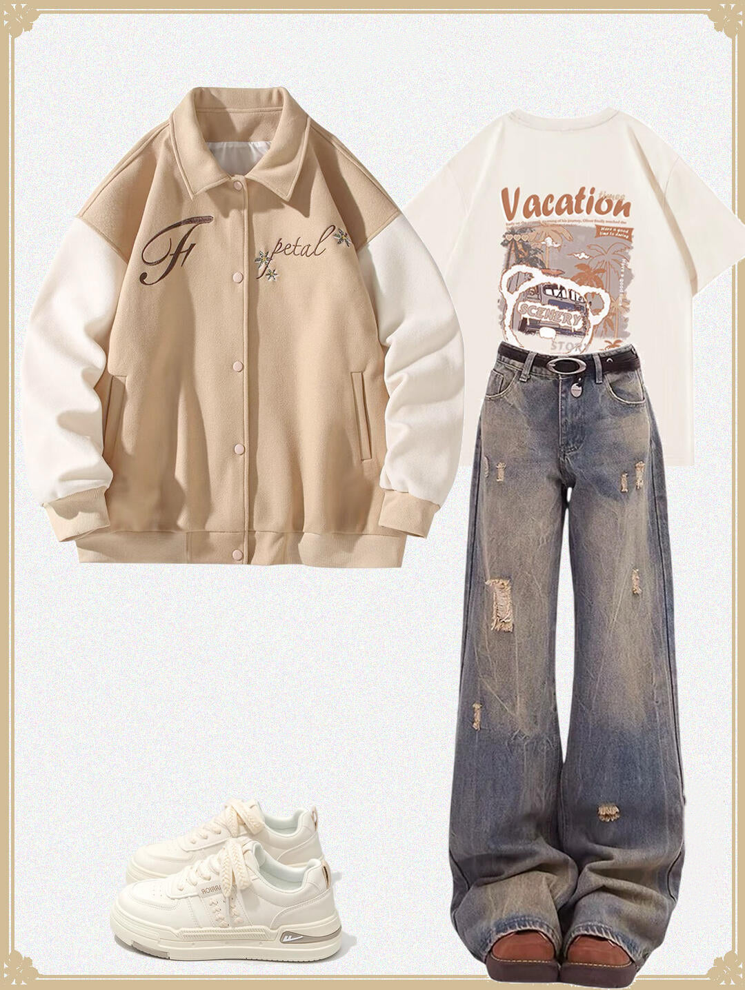 男女兼用スタジャン - カジュアルな配色スリーブ付きボタンジャケット/ハイウエストルーズフィットダメージジーンズ - トレンドストレートワイドレッグヴィンテージ風ファッションデニムパンツ番号ZT687