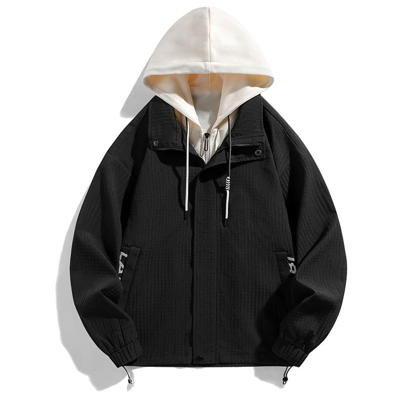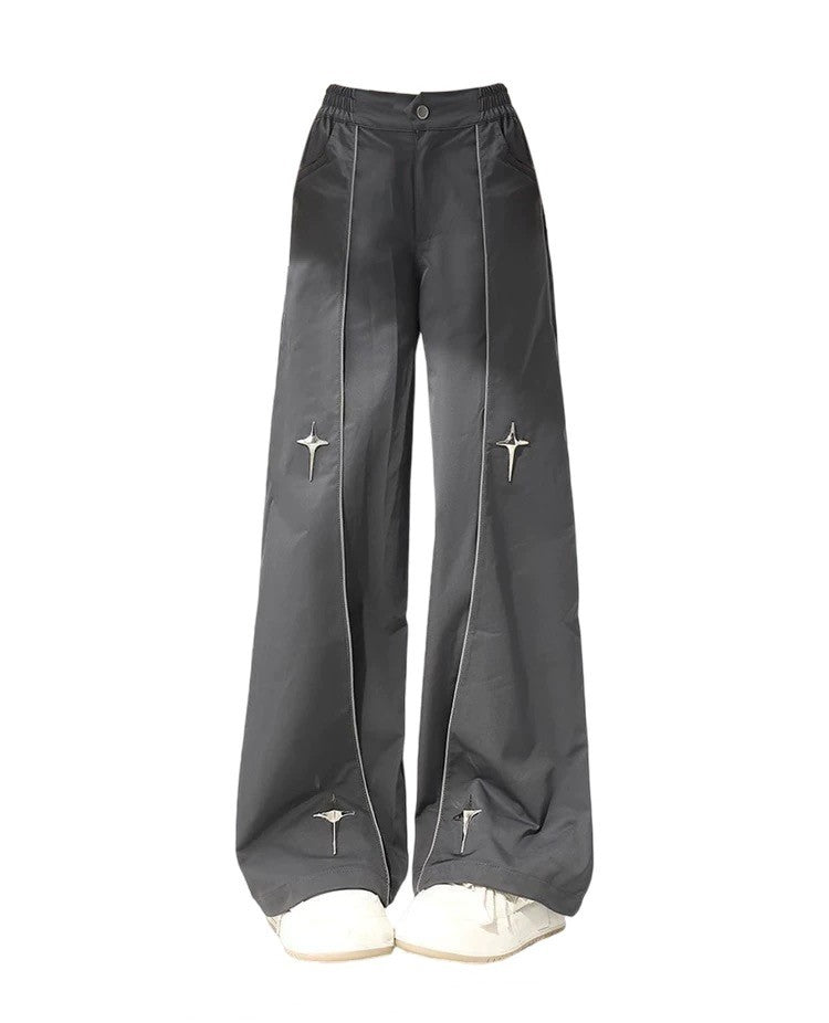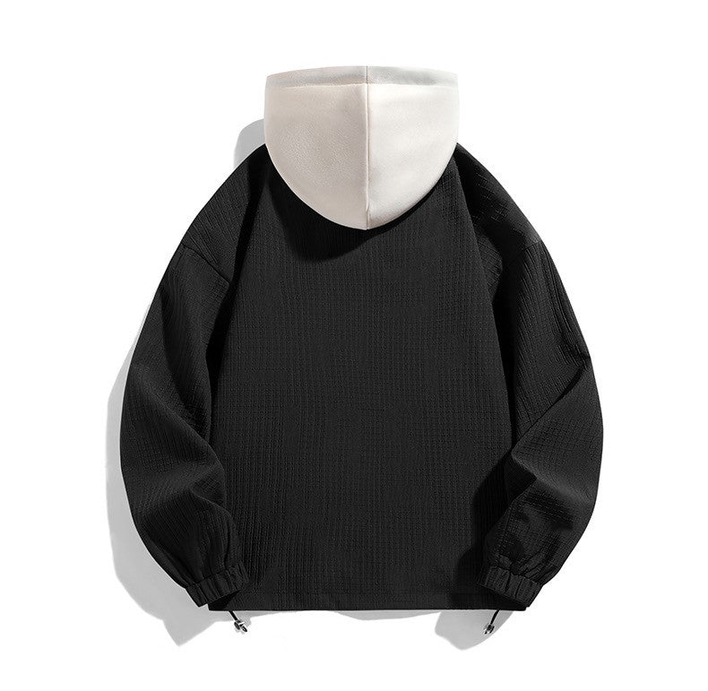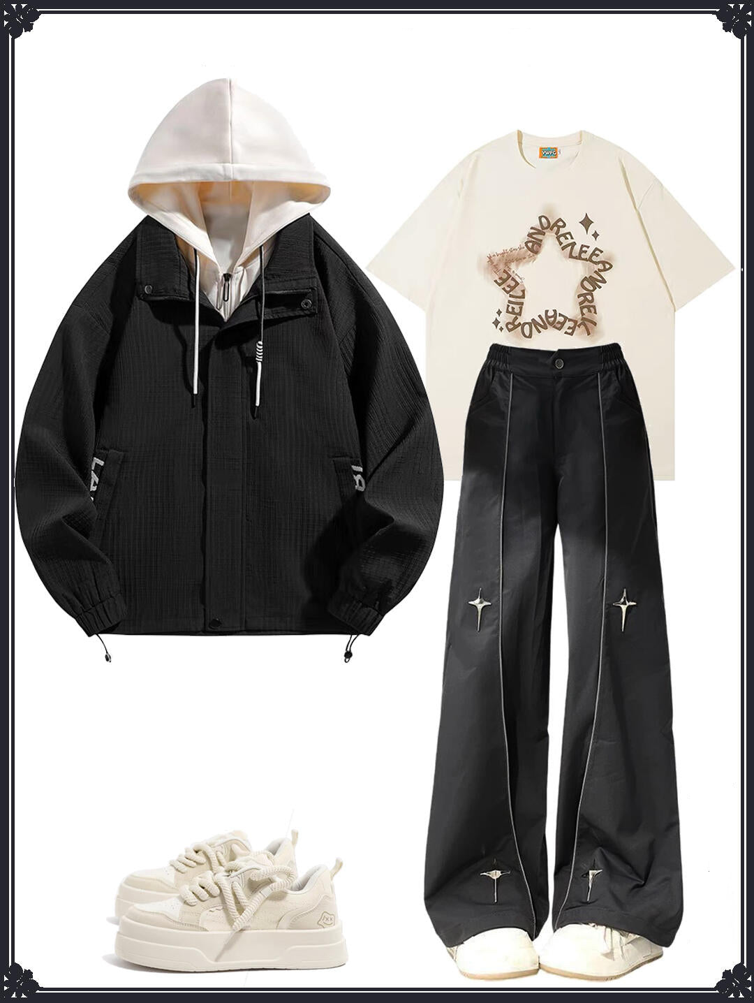 男女兼用ルーズフィットフードジャケット - カジュアルストリートスタイル防風アウター コントラスト配色フード付き/ハイウエストルーズフィットストレートパンツ - トレンドメタル装飾デザインワイドレッグパンツ ファッションカジュアル万能ロングパンツ番号ZT686
