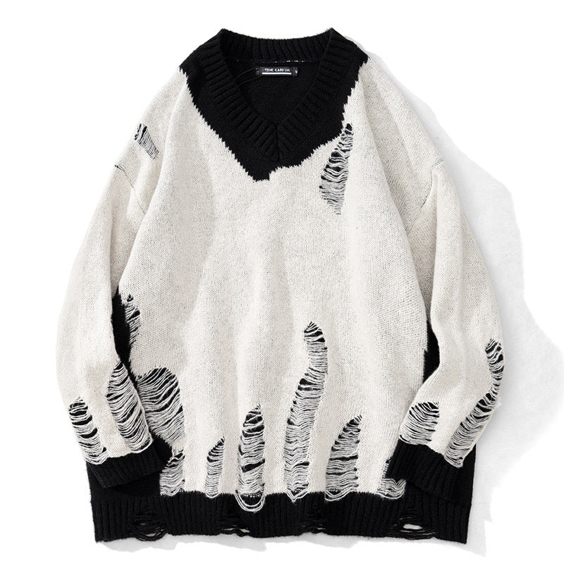 穴あきVネックジャケットアメカジゆったりセーター男女欧米ストリートニット番号ZT456