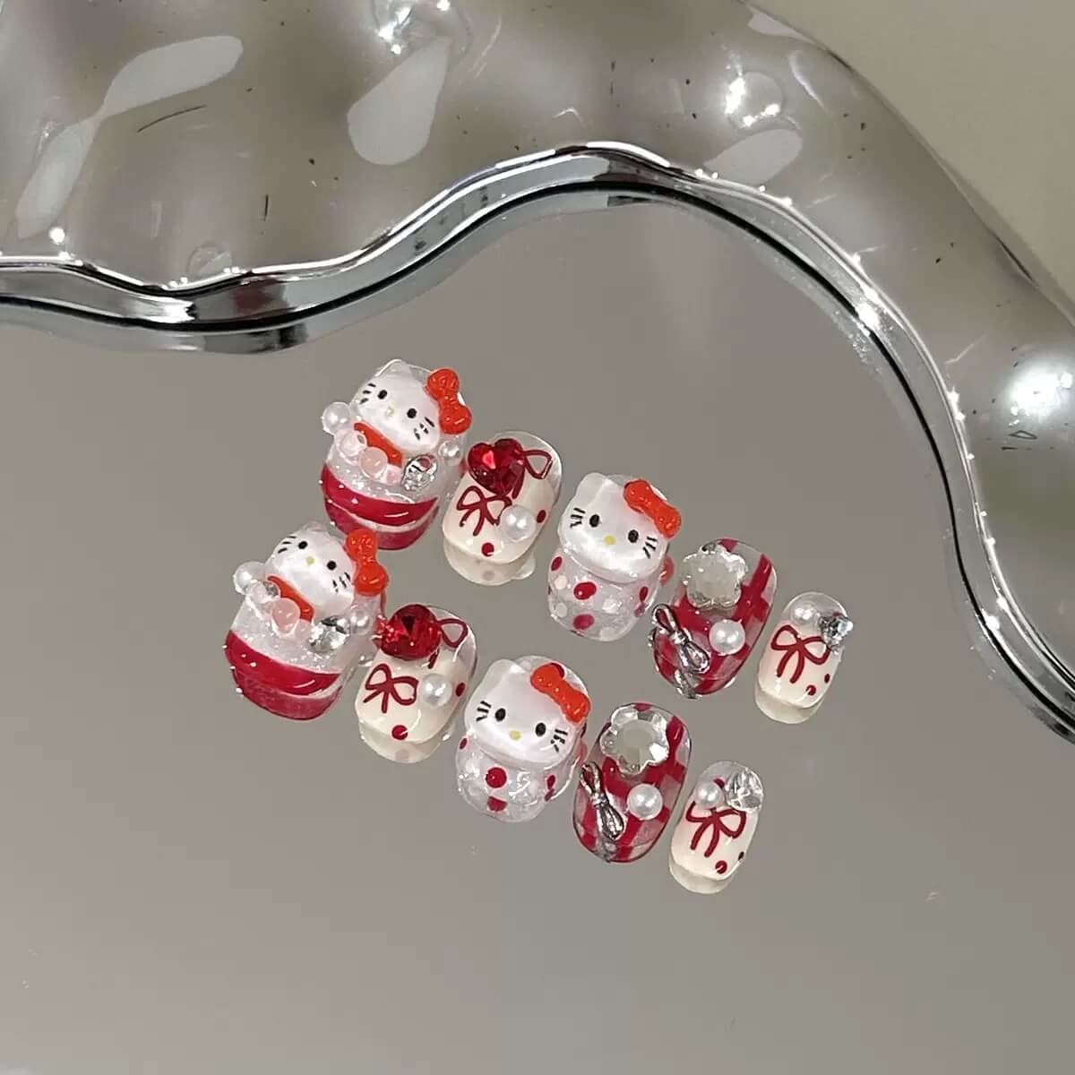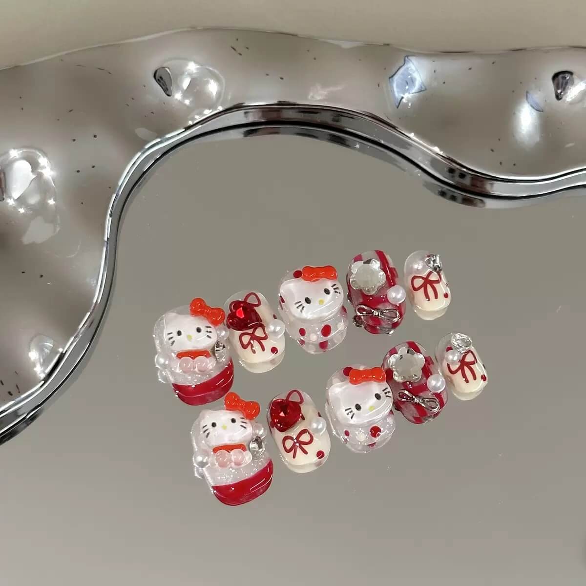 立体ハローキティ&リボンネイル|レッド×ホワイトのガーリー系つけ爪番号1904