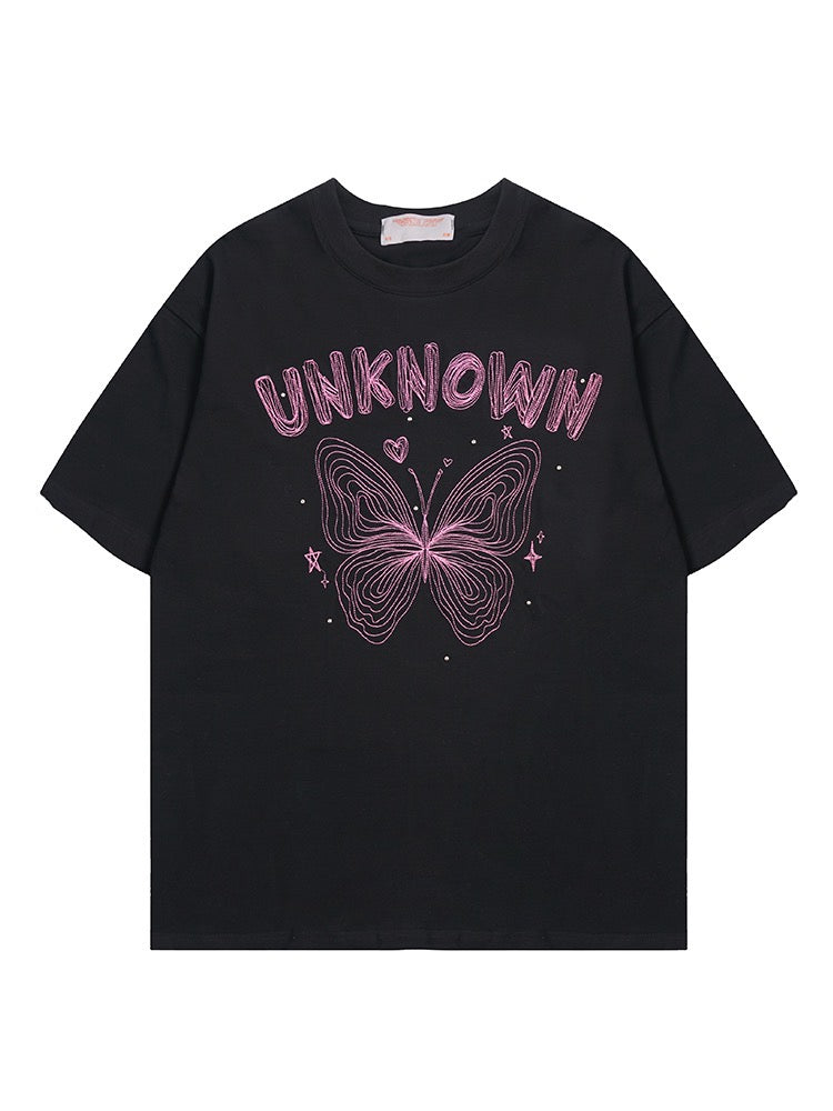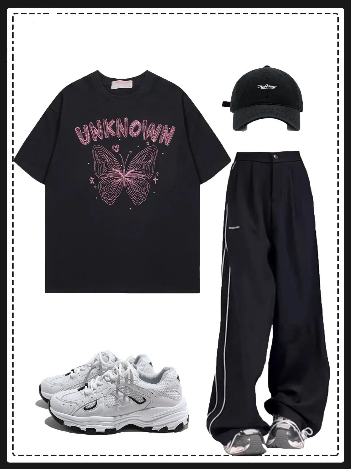 蝶刺繍半袖Tシャツ2023新作ゆったりアメリカンヒップホップカップルTシャツ アメリカンoversizeパンツ女性ゆったりカジュアルブラックドレープボーダーワイドレッグパンツ番号ZT166